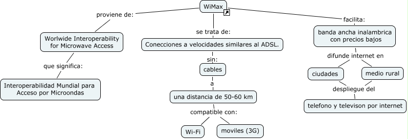 Este Cmap, tiene información relacionada con: WiMax, cables a una distancia de 50-60 km, banda ancha inalambrica con precios bajos difunde internet en medio rural, una distancia de 50-60 km compatible con: Wi-Fi, WiMax se trata de: Conecciones a velocidades similares al ADSL., WiMax proviene de: Worlwide Interoperability for Microwave Access, banda ancha inalambrica con precios bajos difunde internet en ciudades, Conecciones a velocidades similares al ADSL. sin: cables, una distancia de 50-60 km compatible con: moviles (3G), ciudades despliegue del telefono y televison por internet, Worlwide Interoperability for Microwave Access que significa: Interoperabilidad Mundial para Acceso por Microondas, WiMax facilita: banda ancha inalambrica con precios bajos, medio rural despliegue del telefono y televison por internet