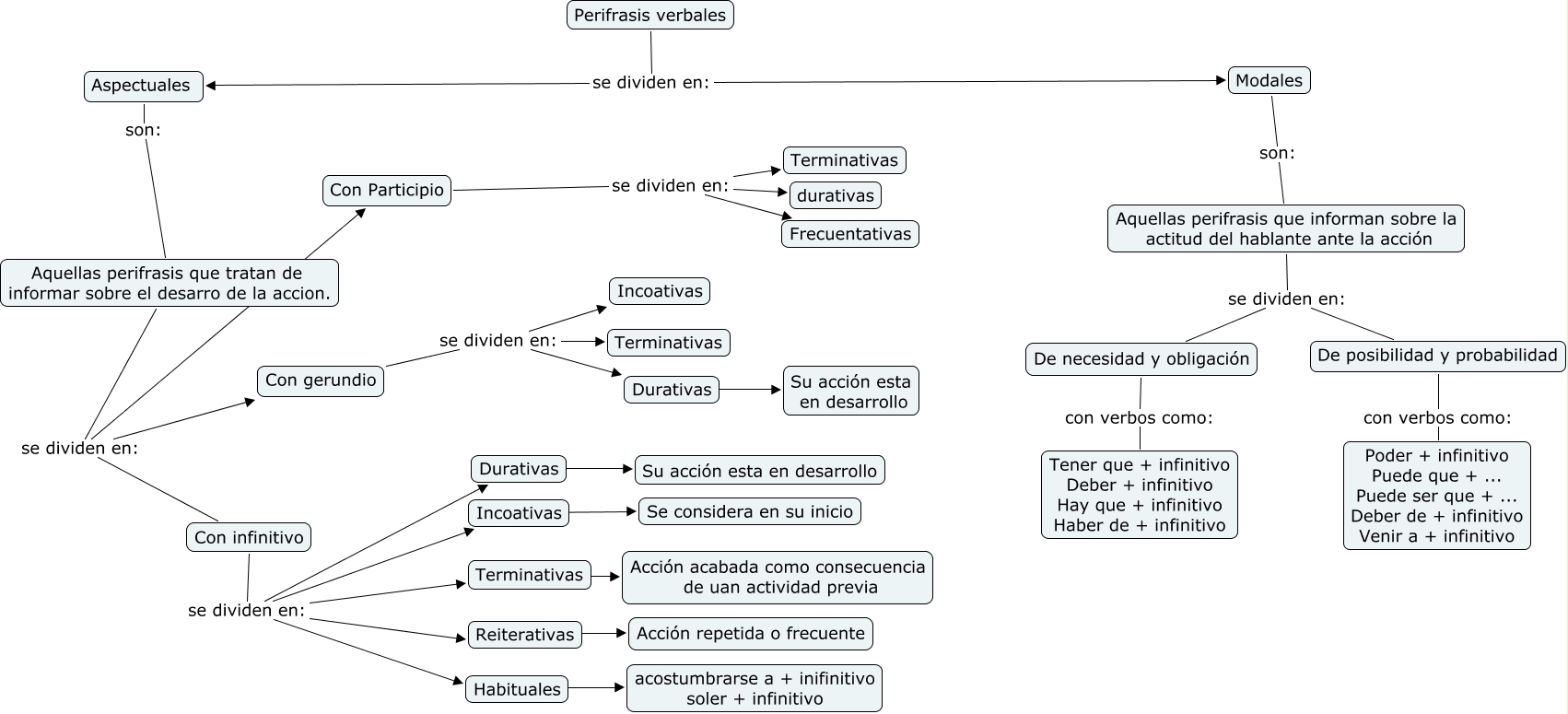 Este Cmap, tiene información relacionada con: Sin Título 1, Con infinitivo se dividen en: Incoativas, Modales son: Aquellas perifrasis que informan sobre la actitud del hablante ante la acción, De posibilidad y probabilidad con verbos como: Poder + infinitivo Puede que + ... Puede ser que + ... Deber de + infinitivo Venir a + infinitivo, Aquellas perifrasis que tratan de informar sobre el desarro de la accion. se dividen en: Con infinitivo, Con Participio se dividen en: durativas, Terminativas ???? Acción acabada como consecuencia de uan actividad previa, Con infinitivo se dividen en: Durativas, Con gerundio se dividen en: Terminativas, Durativas ???? Su acción esta en desarrollo, Con gerundio se dividen en: Incoativas, Con infinitivo se dividen en: Terminativas, Con infinitivo se dividen en: Habituales, Con Participio se dividen en: Terminativas, Con gerundio se dividen en: Durativas, Aquellas perifrasis que tratan de informar sobre el desarro de la accion. se dividen en: Con Participio, Perifrasis verbales se dividen en: Modales, Con Participio se dividen en: Frecuentativas, Aspectuales son: Aquellas perifrasis que tratan de informar sobre el desarro de la accion., Aquellas perifrasis que tratan de informar sobre el desarro de la accion. se dividen en: Con gerundio, Aquellas perifrasis que informan sobre la actitud del hablante ante la acción se dividen en: De necesidad y obligación