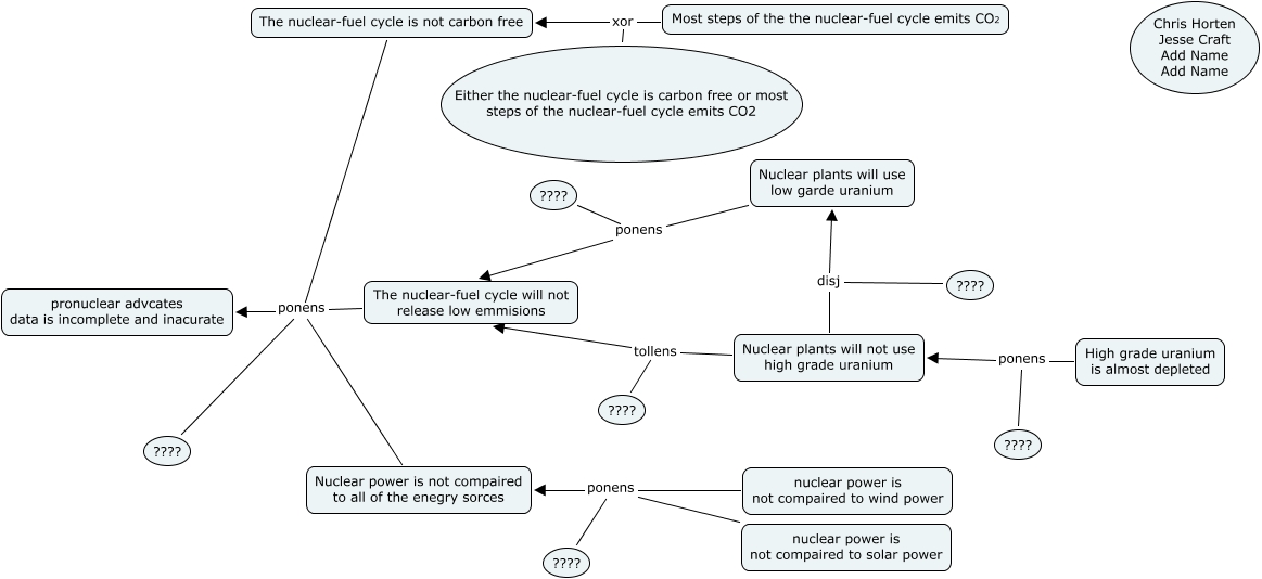 This Concept Map, created with IHMC CmapTools, has information related to: C Draft 2, ???? ponens The nuclear-fuel cycle will not release low emmisions, nuclear power is not compaired to wind power ponens Nuclear power is not compaired to all of the enegry sorces, Nuclear plants will not use high grade uranium tollens The nuclear-fuel cycle will not release low emmisions, Nuclear plants will use low garde uranium ponens The nuclear-fuel cycle will not release low emmisions, ???? ponens Nuclear plants will not use high grade uranium, ???? ponens pronuclear advcates data is incomplete and inacurate, Either the nuclear-fuel cycle is carbon free or most steps of the nuclear-fuel cycle emits CO2 xor The nuclear-fuel cycle is not carbon free, ???? disj Nuclear plants will use low garde uranium, Nuclear plants will not use high grade uranium disj Nuclear plants will use low garde uranium, ???? tollens The nuclear-fuel cycle will not release low emmisions, Nuclear power is not compaired to all of the enegry sorces ponens pronuclear advcates data is incomplete and inacurate, Most steps of the the nuclear-fuel cycle emits CO2 xor The nuclear-fuel cycle is not carbon free, The nuclear-fuel cycle is not carbon free ponens pronuclear advcates data is incomplete and inacurate, ???? ponens Nuclear power is not compaired to all of the enegry sorces, The nuclear-fuel cycle will not release low emmisions ponens pronuclear advcates data is incomplete and inacurate, High grade uranium is almost depleted ponens Nuclear plants will not use high grade uranium, nuclear power is not compaired to solar power ponens Nuclear power is not compaired to all of the enegry sorces