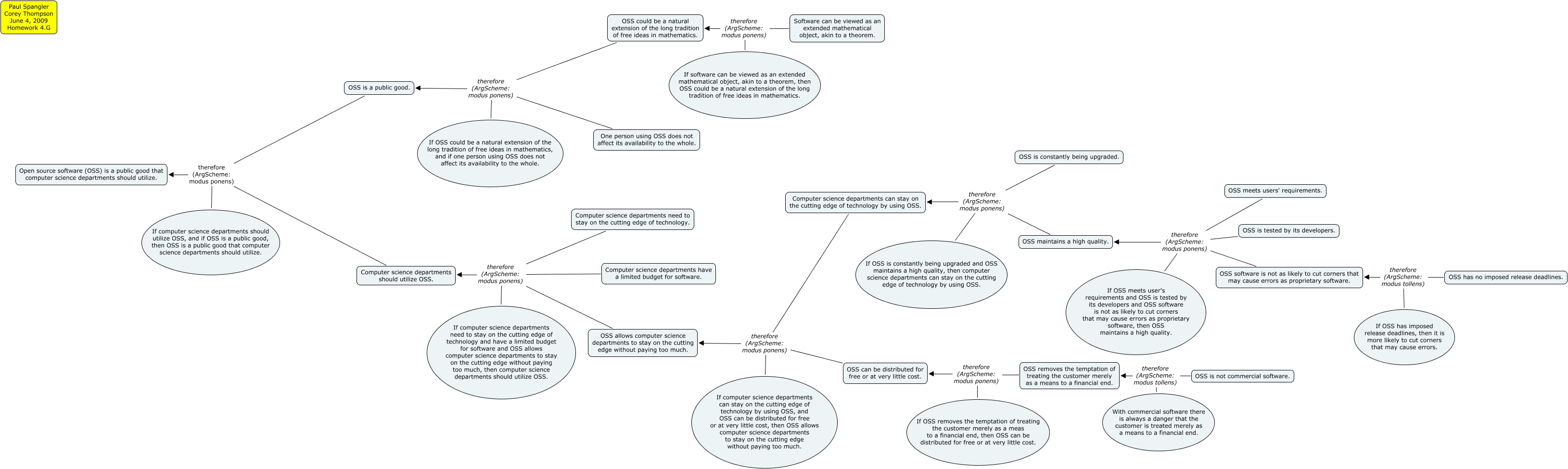 This Concept Map, created with IHMC CmapTools, has information related to: hw_4.G, If computer science departments should utilize OSS, and if OSS is a public good, then OSS is a public good that computer science departments should utilize. therefore (ArgScheme: modus ponens) Open source software (OSS) is a public good that computer science departments should utilize., If computer science departments can stay on the cutting edge of technology by using OSS, and OSS can be distributed for free or at very little cost, then OSS allows computer science departments to stay on the cutting edge without paying too much. therefore (ArgScheme: modus ponens) OSS allows computer science departments to stay on the cutting edge without paying too much., Computer science departments should utilize OSS. therefore (ArgScheme: modus ponens) Open source software (OSS) is a public good that computer science departments should utilize., If OSS is constantly being upgraded and OSS maintains a high quality, then computer science departments can stay on the cutting edge of technology by using OSS. therefore (ArgScheme: modus ponens) Computer science departments can stay on the cutting edge of technology by using OSS., With commercial software there is always a danger that the customer is treated merely as a means to a financial end. therefore (ArgScheme: modus tollens) OSS removes the temptation of treating the customer merely as a means to a financial end., OSS removes the temptation of treating the customer merely as a means to a financial end. therefore (ArgScheme: modus ponens) OSS can be distributed for free or at very little cost., If software can be viewed as an extended mathematical object, akin to a theorem, then OSS could be a natural extension of the long tradition of free ideas in mathematics. therefore (ArgScheme: modus ponens) OSS could be a natural extension of the long tradition of free ideas in mathematics., If OSS removes the temptation of treating the customer merely as a meas to a financial end, then OSS can be distributed for free or at very little cost. therefore (ArgScheme: modus ponens) OSS can be distributed for free or at very little cost., Software can be viewed as an extended mathematical object, akin to a theorem. therefore (ArgScheme: modus ponens) OSS could be a natural extension of the long tradition of free ideas in mathematics., OSS software is not as likely to cut corners that may cause errors as proprietary software. therefore (ArgScheme: modus ponens) OSS maintains a high quality., If OSS meets user's requirements and OSS is tested by its developers and OSS software is not as likely to cut corners that may cause errors as proprietary software, then OSS maintains a high quality. therefore (ArgScheme: modus ponens) OSS maintains a high quality., OSS is not commercial software. therefore (ArgScheme: modus tollens) OSS removes the temptation of treating the customer merely as a means to a financial end., OSS is tested by its developers. therefore (ArgScheme: modus ponens) OSS maintains a high quality., Computer science departments can stay on the cutting edge of technology by using OSS. therefore (ArgScheme: modus ponens) OSS allows computer science departments to stay on the cutting edge without paying too much., Computer science departments have a limited budget for software. therefore (ArgScheme: modus ponens) Computer science departments should utilize OSS., OSS allows computer science departments to stay on the cutting edge without paying too much. therefore (ArgScheme: modus ponens) Computer science departments should utilize OSS., OSS could be a natural extension of the long tradition of free ideas in mathematics. therefore (ArgScheme: modus ponens) OSS is a public good., If OSS has imposed release deadlines, then it is more likely to cut corners that may cause errors. therefore (ArgScheme: modus tollens) OSS software is not as likely to cut corners that may cause errors as proprietary software., OSS can be distributed for free or at very little cost. therefore (ArgScheme: modus ponens) OSS allows computer science departments to stay on the cutting edge without paying too much., OSS is a public good. therefore (ArgScheme: modus ponens) Open source software (OSS) is a public good that computer science departments should utilize.
