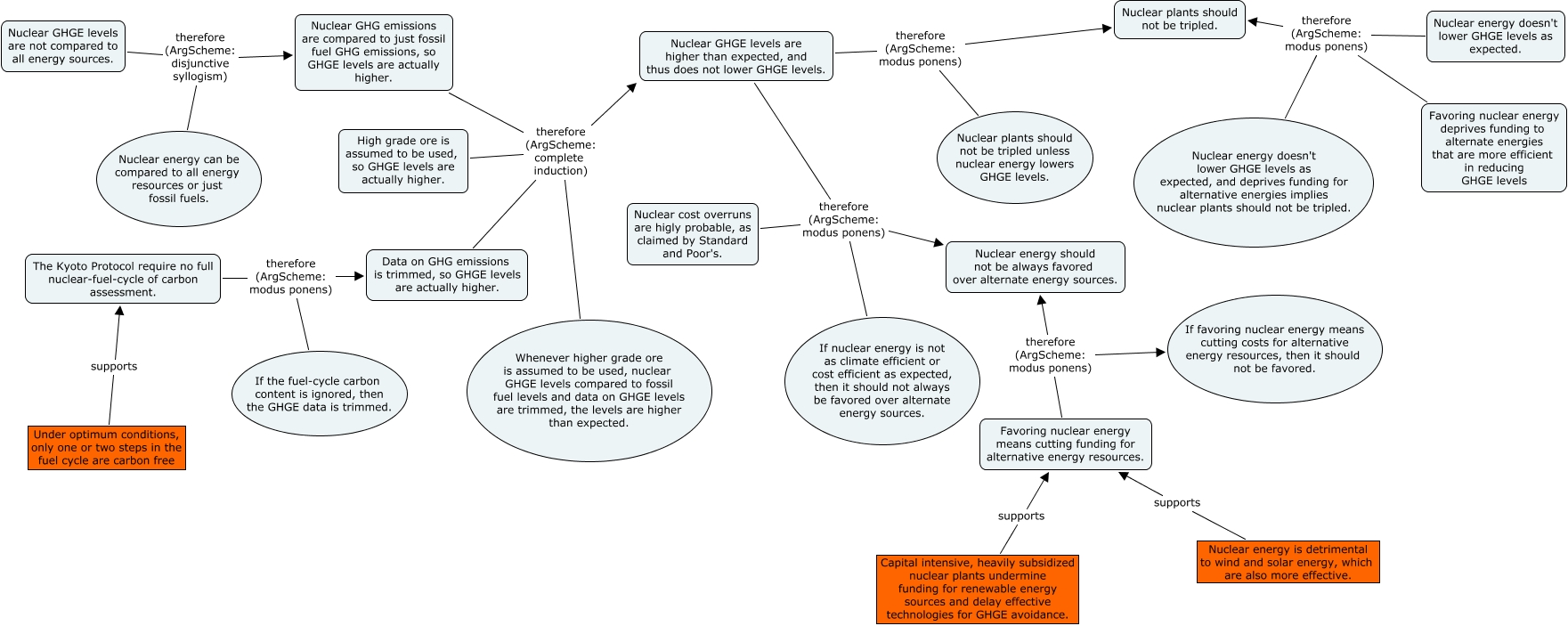 This Concept Map, created with IHMC CmapTools, has information related to: draft1, Nuclear GHG emissions are compared to just fossil fuel GHG emissions, so GHGE levels are actually higher. therefore (ArgScheme: complete induction) Nuclear GHGE levels are higher than expected, and thus does not lower GHGE levels., Capital intensive, heavily subsidized nuclear plants undermine funding for renewable energy sources and delay effective technologies for GHGE avoidance. supports Favoring nuclear energy means cutting funding for alternative energy resources., Data on GHG emissions is trimmed, so GHGE levels are actually higher. therefore (ArgScheme: complete induction) Whenever higher grade ore is assumed to be used, nuclear GHGE levels compared to fossil fuel levels and data on GHGE levels are trimmed, the levels are higher than expected., High grade ore is assumed to be used, so GHGE levels are actually higher. therefore (ArgScheme: complete induction) Nuclear GHGE levels are higher than expected, and thus does not lower GHGE levels., Nuclear GHGE levels are higher than expected, and thus does not lower GHGE levels. therefore (ArgScheme: modus ponens) Nuclear plants should not be tripled unless nuclear energy lowers GHGE levels., Favoring nuclear energy deprives funding to alternate energies that are more efficient in reducing GHGE levels therefore (ArgScheme: modus ponens) Nuclear plants should not be tripled., Favoring nuclear energy deprives funding to alternate energies that are more efficient in reducing GHGE levels therefore (ArgScheme: modus ponens) Nuclear energy doesn't lower GHGE levels as expected, and deprives funding for alternative energies implies nuclear plants should not be tripled., Favoring nuclear energy means cutting funding for alternative energy resources. therefore (ArgScheme: modus ponens) If favoring nuclear energy means cutting costs for alternative energy resources, then it should not be favored., The Kyoto Protocol require no full nuclear-fuel-cycle of carbon assessment. therefore (ArgScheme: modus ponens) Data on GHG emissions is trimmed, so GHGE levels are actually higher., Nuclear cost overruns are higly probable, as claimed by Standard and Poor's. therefore (ArgScheme: modus ponens) Nuclear energy should not be always favored over alternate energy sources., Data on GHG emissions is trimmed, so GHGE levels are actually higher. therefore (ArgScheme: complete induction) Nuclear GHGE levels are higher than expected, and thus does not lower GHGE levels., Nuclear cost overruns are higly probable, as claimed by Standard and Poor's. therefore (ArgScheme: modus ponens) If nuclear energy is not as climate efficient or cost efficient as expected, then it should not always be favored over alternate energy sources., High grade ore is assumed to be used, so GHGE levels are actually higher. therefore (ArgScheme: complete induction) Whenever higher grade ore is assumed to be used, nuclear GHGE levels compared to fossil fuel levels and data on GHGE levels are trimmed, the levels are higher than expected., Nuclear GHGE levels are higher than expected, and thus does not lower GHGE levels. therefore (ArgScheme: modus ponens) If nuclear energy is not as climate efficient or cost efficient as expected, then it should not always be favored over alternate energy sources., Nuclear GHGE levels are not compared to all energy sources. therefore (ArgScheme: disjunctive syllogism) Nuclear energy can be compared to all energy resources or just fossil fuels., Nuclear GHGE levels are higher than expected, and thus does not lower GHGE levels. therefore (ArgScheme: modus ponens) Nuclear plants should not be tripled., Nuclear GHGE levels are higher than expected, and thus does not lower GHGE levels. therefore (ArgScheme: modus ponens) Nuclear energy should not be always favored over alternate energy sources., Nuclear GHG emissions are compared to just fossil fuel GHG emissions, so GHGE levels are actually higher. therefore (ArgScheme: complete induction) Whenever higher grade ore is assumed to be used, nuclear GHGE levels compared to fossil fuel levels and data on GHGE levels are trimmed, the levels are higher than expected., Under optimum conditions, only one or two steps in the fuel cycle are carbon free supports The Kyoto Protocol require no full nuclear-fuel-cycle of carbon assessment., Nuclear energy doesn't lower GHGE levels as expected. therefore (ArgScheme: modus ponens) Nuclear energy doesn't lower GHGE levels as expected, and deprives funding for alternative energies implies nuclear plants should not be tripled.