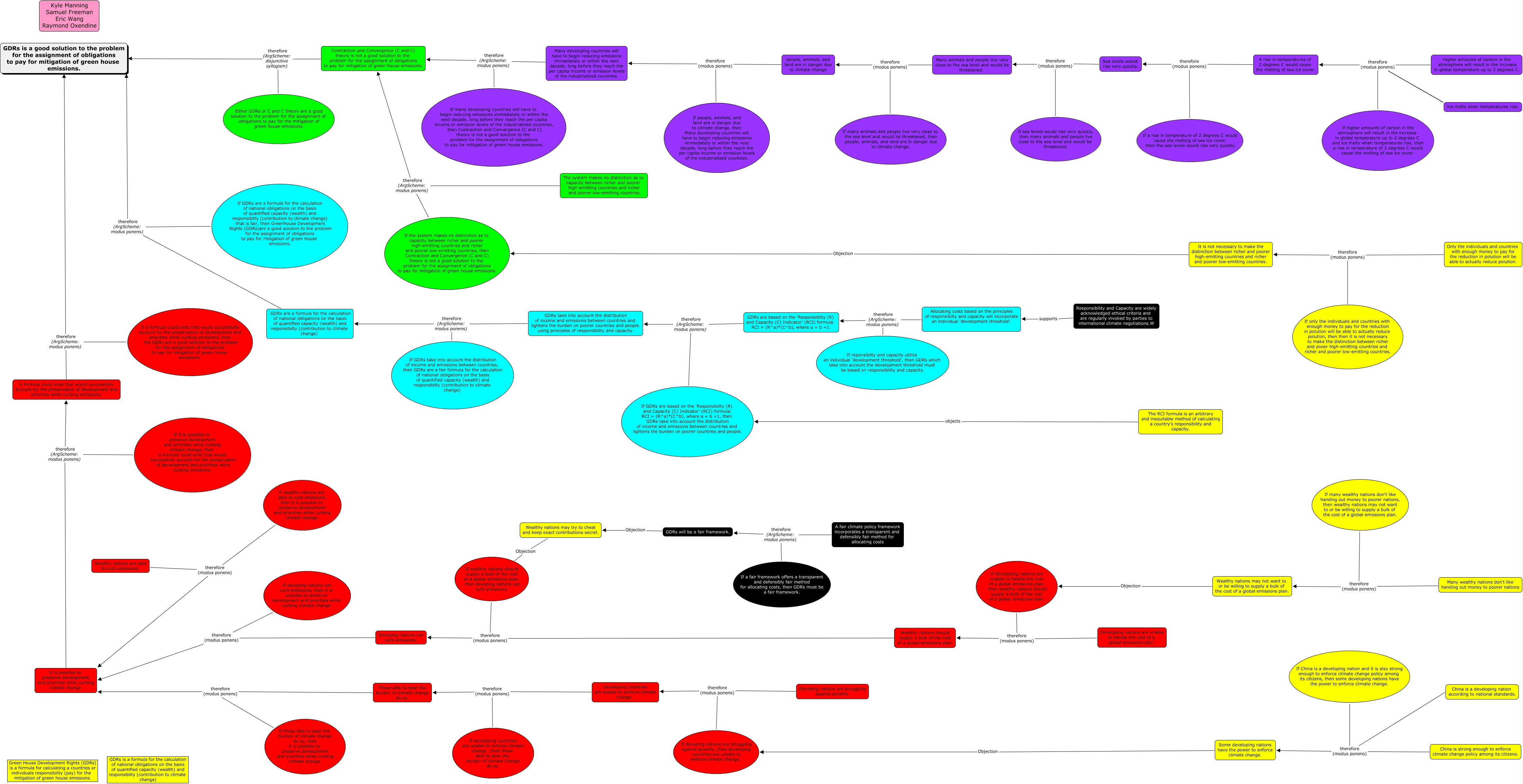 This Concept Map, created with IHMC CmapTools, has information related to: HW5g, If GDRs are based on the 'Responsibilty (R) and Capacity (C) Indicator' (RCI) formula: RCI = (R^a)*(C^b), where a + b =1, then GDRs take into account the distribution of income and emissions between countries and lightens the burden on poorer countries and people. therefore (ArgScheme: modus ponens) GDRs take into account the distribution of income and emissions between countries and lightens the burden on poorer countries and people. using principles of responsibility and capacity., If it is possible to preserve development and priorities while curbing climate change, then a formula could exist that would successfully account for the preservation of development and priorities while curbing emissions. therefore (ArgScheme: modus ponens) A formula could exist that would successfully account for the preservation of development and priorities while curbing emissions., If GDRs are a formula for the calculation of national obligations on the basis of quantified capacity (wealth) and responsibilty (contribution to climate change) that is fair, then Greenhouse Development Rights (GDRs)are a good solution to the problem for the assignment of obligations to pay for mitigation of green house emissions. therefore (ArgScheme: modus ponens) GDRs is a good solution to the problem for the assignment of obligations to pay for mitigation of green house emissions., If devoping nations are struggling against poverty ,then developing countries are unable to enforce climate change. therefore (modus ponens) Developing countries are unable to enforce climate change., If a formula could exist that would successfully account for the preservation of development and priorities while curbing emissions, then the GDRs are a good solution to the problem for the assignment of obligations to pay for mitigation of green house emissions. therefore (ArgScheme: modus ponens) GDRs is a good solution to the problem for the assignment of obligations to pay for mitigation of green house emissions., If reponsibilty and capacity utilize an individual 'development threshold', then GDRs which take into account the development threshold must be based on responsibility and capacity. therefore (ArgScheme: modus ponens) GDRs are based on the 'Responsibilty (R) and Capacity (C) Indicator' (RCI) formula. RCI = (R^a)*(C^b), where a + b =1., people, animals, and land are in danger due to climate change therefore (modus ponens) Many developing countries will have to begin reducing emissions immediately or within the next decade, long before they reach the per capita income or emission levels of the industrialized countries., Allocating costs based on the principles of responsibilty and capacity will incorporate an individual 'development threshold'. therefore (ArgScheme: modus ponens) GDRs are based on the 'Responsibilty (R) and Capacity (C) Indicator' (RCI) formula. RCI = (R^a)*(C^b), where a + b =1., It is not necessary to make the distinction between richer and poorer high-emitting countries and richer and poorer low-emitting countries. Objection If the system makes no distinction as to capacity between richer and poorer high-emitting countries and richer and poorer low-emitting countries, then Contraction and Convergence (C and C) theory is not a good solution to the problem for the assignment of obligations to pay for mitigation of green house emissions., If people, animals, and land are in danger due to climate change, then Many developing countries will have to begin reducing emissions immediately or within the next decade, long before they reach the per capita income or emission levels of the industrialized countries. therefore (modus ponens) Many developing countries will have to begin reducing emissions immediately or within the next decade, long before they reach the per capita income or emission levels of the industrialized countries., Devoping nations can curb emissions. therefore (modus ponens) It is possible to preserve development and priorities while curbing climate change., It is possible to preserve development and priorities while curbing climate change. therefore (ArgScheme: modus ponens) A formula could exist that would successfully account for the preservation of development and priorities while curbing emissions., Wealthy nations may try to cheat and keep exact contributions secret. Objection If wealthy nations should supply a bulk of the cost of a global emissions plan, then devoping nations can curb emissions., Devoping nations are struggling against poverty. therefore (modus ponens) Developing countries are unable to enforce climate change., If a rise in temperature of 2 degrees C would cause the melting of sea ice cover, then the sea levels would rise very quickly. therefore (modus ponens) Sea levels would rise very quickly., If developing nations are unable to handle the cost of a global emissions plan, then wealthy nations should supply a bulk of the cost of a global emissions plan. therefore (modus ponens) Wealthy nations should supply a bulk of the cost of a global emissions plan., Many wealthy nations don't like handing out money to poorer nations therefore (modus ponens) Wealthy nations may not want to or be willing to supply a bulk of the cost of a global emissions plan., Ice melts when temperatures rise. therefore (modus ponens) A rise in temperatures of 2 degrees C would cause the melting of sea ice cover., A formula could exist that would successfully account for the preservation of development and priorities while curbing emissions. therefore (ArgScheme: modus ponens) GDRs is a good solution to the problem for the assignment of obligations to pay for mitigation of green house emissions., If many animals and people live very close to the sea level and would be threatened, then people, animals, and land are in danger due to climate change. therefore (modus ponens) people, animals, and land are in danger due to climate change