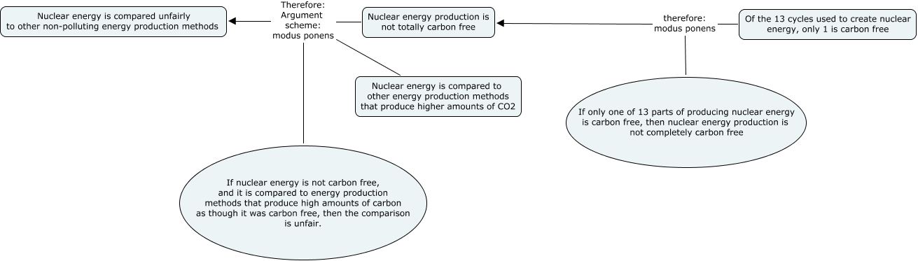 This Concept Map, created with IHMC CmapTools, has information related to: Jeremy Global Nuclear, Of the 13 cycles used to create nuclear energy, only 1 is carbon free therefore: modus ponens Nuclear energy production is not totally carbon free, If only one of 13 parts of producing nuclear energy is carbon free, then nuclear energy production is not completely carbon free therefore: modus ponens Nuclear energy production is not totally carbon free, Nuclear energy is compared to other energy production methods that produce higher amounts of CO2 Therefore: Argument scheme: modus ponens Nuclear energy is compared unfairly to other non-polluting energy production methods, Nuclear energy production is not totally carbon free Therefore: Argument scheme: modus ponens Nuclear energy is compared unfairly to other non-polluting energy production methods, If nuclear energy is not carbon free, and it is compared to energy production methods that produce high amounts of carbon as though it was carbon free, then the comparison is unfair. Therefore: Argument scheme: modus ponens Nuclear energy is compared unfairly to other non-polluting energy production methods