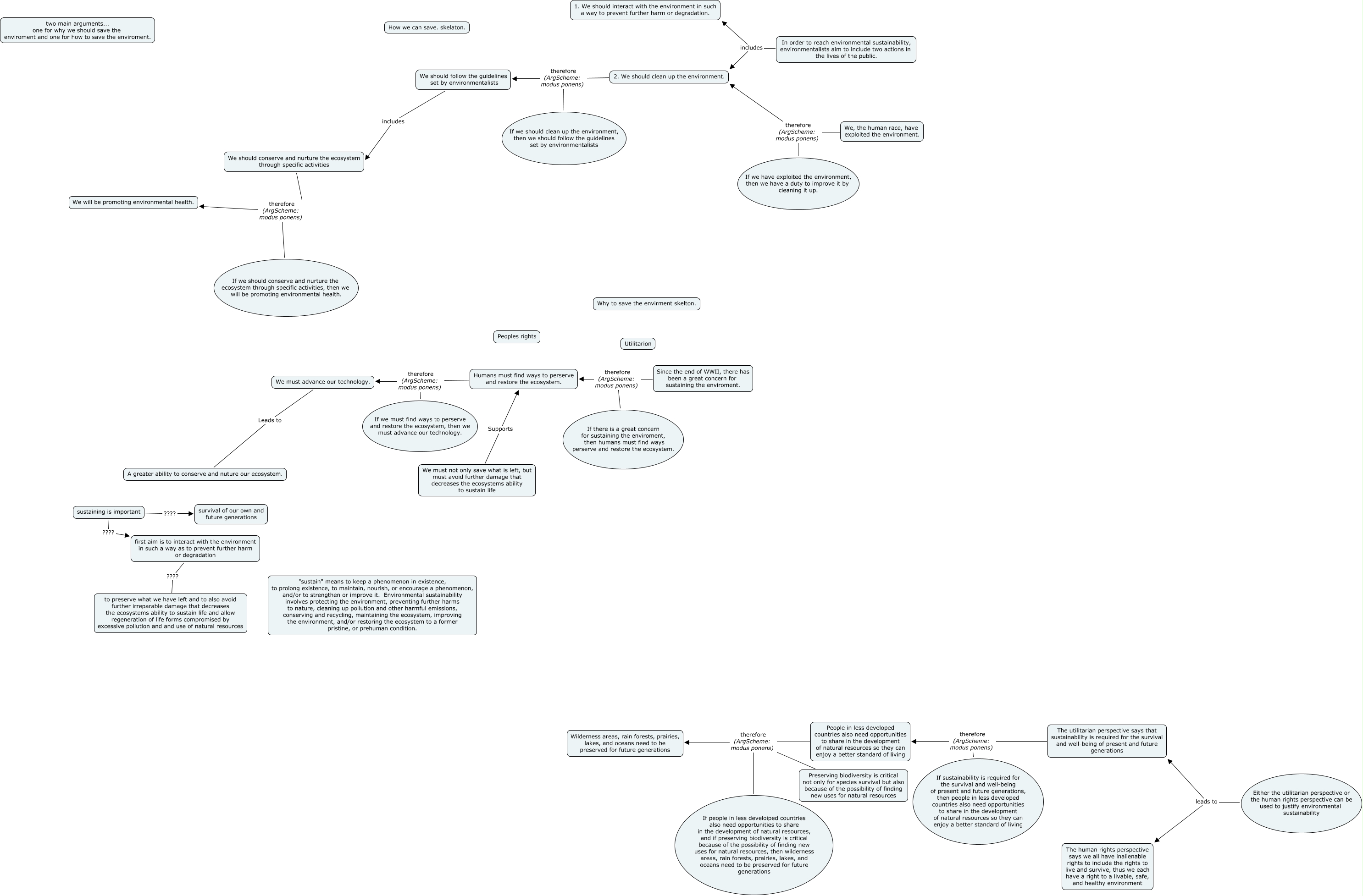 This Concept Map, created with IHMC CmapTools, has information related to: 7-2-09Sustain, sustaining is important ???? first aim is to interact with the environment in such a way as to prevent further harm or degradation, If we should clean up the environment, then we should follow the guidelines set by environmentalists therefore (ArgScheme: modus ponens) We should follow the guidelines set by environmentalists, In order to reach environmental sustainability, environmentalists aim to include two actions in the lives of the public. includes 1. We should interact with the environment in such a way to prevent further harm or degradation., If we have exploited the environment, then we have a duty to improve it by cleaning it up. therefore (ArgScheme: modus ponens) 2. We should clean up the environment., We must advance our technology. Leads to A greater ability to conserve and nuture our ecosystem., 2. We should clean up the environment. therefore (ArgScheme: modus ponens) We should follow the guidelines set by environmentalists, sustaining is important ???? survival of our own and future generations, We should follow the guidelines set by environmentalists includes We should conserve and nurture the ecosystem through specific activities, Since the end of WWII, there has been a great concern for sustaining the enviroment. therefore (ArgScheme: modus ponens) Humans must find ways to perserve and restore the ecosystem., We must not only save what is left, but must avoid further damage that decreases the ecosystems ability to sustain life Supports Humans must find ways to perserve and restore the ecosystem., Either the utilitarian perspective or the human rights perspective can be used to justify environmental sustainability leads to The utilitarian perspective says that sustainability is required for the survival and well-being of present and future generations, People in less developed countries also need opportunities to share in the development of natural resources so they can enjoy a better standard of living therefore (ArgScheme: modus ponens) Wilderness areas, rain forests, prairies, lakes, and oceans need to be preserved for future generations, If sustainability is required for the survival and well-being of present and future generations, then people in less developed countries also need opportunities to share in the development of natural resources so they can enjoy a better standard of living therefore (ArgScheme: modus ponens) People in less developed countries also need opportunities to share in the development of natural resources so they can enjoy a better standard of living, The utilitarian perspective says that sustainability is required for the survival and well-being of present and future generations therefore (ArgScheme: modus ponens) People in less developed countries also need opportunities to share in the development of natural resources so they can enjoy a better standard of living, Humans must find ways to perserve and restore the ecosystem. therefore (ArgScheme: modus ponens) We must advance our technology., We, the human race, have exploited the environment. therefore (ArgScheme: modus ponens) 2. We should clean up the environment., If people in less develoiped countries also need opportunities to share in the development of natural resources, and if preserving biodiversity is critical because of the possibility of finding new uses for natural resources, then wilderness areas, rain forests, prairies, lakes, and oceans need to be preserved for future generations therefore (ArgScheme: modus ponens) Wilderness areas, rain forests, prairies, lakes, and oceans need to be preserved for future generations, In order to reach environmental sustainability, environmentalists aim to include two actions in the lives of the public. includes 2. We should clean up the environment., Either the utilitarian perspective or the human rights perspective can be used to justify environmental sustainability leads to The human rights perspective says we all have inalienable rights to include the rights to live and survive, thus we each have a right to a livable, safe, and healthy environment, Preserving biodiversity is critical not only for species survival but also because of the possibility of finding new uses for natural resources therefore (ArgScheme: modus ponens) Wilderness areas, rain forests, prairies, lakes, and oceans need to be preserved for future generations