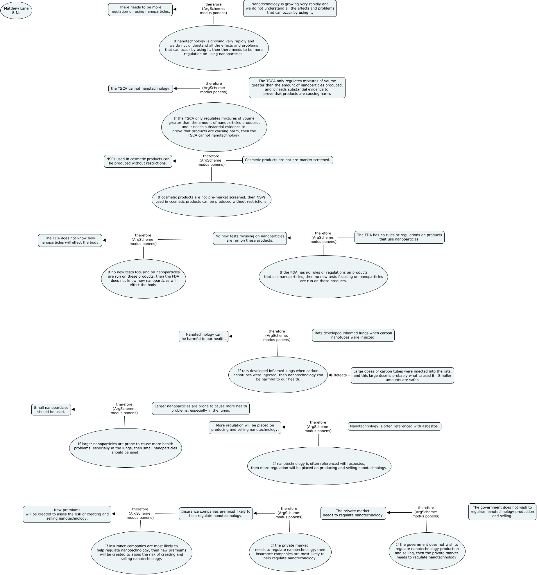 This Concept Map, created with IHMC CmapTools, has information related to: nano2-2, Insurance companies are most likely to help regulate nanotechnology. therefore (ArgScheme: modus ponens) New premiums will be created to asses the risk of creating and selling nanotechnology., If insurance companies are most likely to help regulate nanotechnology, then new premiums will be created to asses the risk of creating and selling nanotechnology. therefore (ArgScheme: modus ponens) New premiums will be created to asses the risk of creating and selling nanotechnology., No new tests focusing on nanoparticles are run on these products. therefore (ArgScheme: modus ponens) The FDA does not know how nanoparticles will effect the body., If cosmetic products are not pre-market screened, then NSPs used in cosmetic products can be produced without restrictions. therefore (ArgScheme: modus ponens) NSPs used in cosmetic products can be produced without restrictions., The FDA has no rules or regulations on products that use nanoparticles. therefore (ArgScheme: modus ponens) No new tests focusing on nanoparticles are run on these products., If no new tests focusing on nanoparticles are run on these products, then the FDA does not know how nanoparticles will effect the body. therefore (ArgScheme: modus ponens) The FDA does not know how nanoparticles will effect the body., Nanotechnology is growing very rapidly and we do not understand all the effects and problems that can occur by using it. therefore (ArgScheme: modus ponens) There needs to be more regulation on using nanoparticles., If nanotechnology is often referenced with asbestos, then more regulation will be placed on producing and selling nanotechnology. therefore (ArgScheme: modus ponens) More regulation will be placed on producing and selling nanotechnology., The private market needs to regulate nanotechnology. therefore (ArgScheme: modus ponens) Insurance companies are most likely to help regulate nanotechnology., The government does not wish to regulate nanotechnology production and selling. therefore (ArgScheme: modus ponens) The private market needs to regulate nanotechnology., If the private market needs to regulate nanotechnology, then insurance companies are most likely to help regulate nanotechnology. therefore (ArgScheme: modus ponens) Insurance companies are most likely to help regulate nanotechnology., If the government does not wish to regulate nanotechnology production and selling, then the private market needs to regulate nanotechnology. therefore (ArgScheme: modus ponens) The private market needs to regulate nanotechnology., Large doses of carbon tubes were injected into the rats, and this large dose is probably what caused it. Smaller amounts are safer. defeats If rats developed inflamed lungs when carbon nanotubes were injected, then nanotechnology can be harmful to our health., If larger nanoparticles are prone to cause more health problems, especially in the lungs, then small nanoparticles should be used. therefore (ArgScheme: modus ponens) Small nanoparticles should be used., If the FDA has no rules or regulations on products that use nanoparticles, then no new tests focusing on nanoparticles are run on these products. therefore (ArgScheme: modus ponens) No new tests focusing on nanoparticles are run on these products., Rats developed inflamed lungs when carbon nanotubes were injected. therefore (ArgScheme: modus ponens) Nanotechnology can be harmful to our health., Nanotechnology is often referenced with asbestos. therefore (ArgScheme: modus ponens) More regulation will be placed on producing and selling nanotechnology., If the TSCA only regulates mixtures of voume greater than the amount of nanoparticles produced, and it needs substantial evidence to prove that products are causing harm, then the TSCA cannot nanotechnology. therefore (ArgScheme: modus ponens) the TSCA cannot nanotechnology., The TSCA only regulates mixtures of voume greater than the amount of nanoparticles produced, and it needs substantial evidence to prove that products are causing harm. therefore (ArgScheme: modus ponens) the TSCA cannot nanotechnology., Cosmetic products are not pre-market screened. therefore (ArgScheme: modus ponens) NSPs used in cosmetic products can be produced without restrictions.