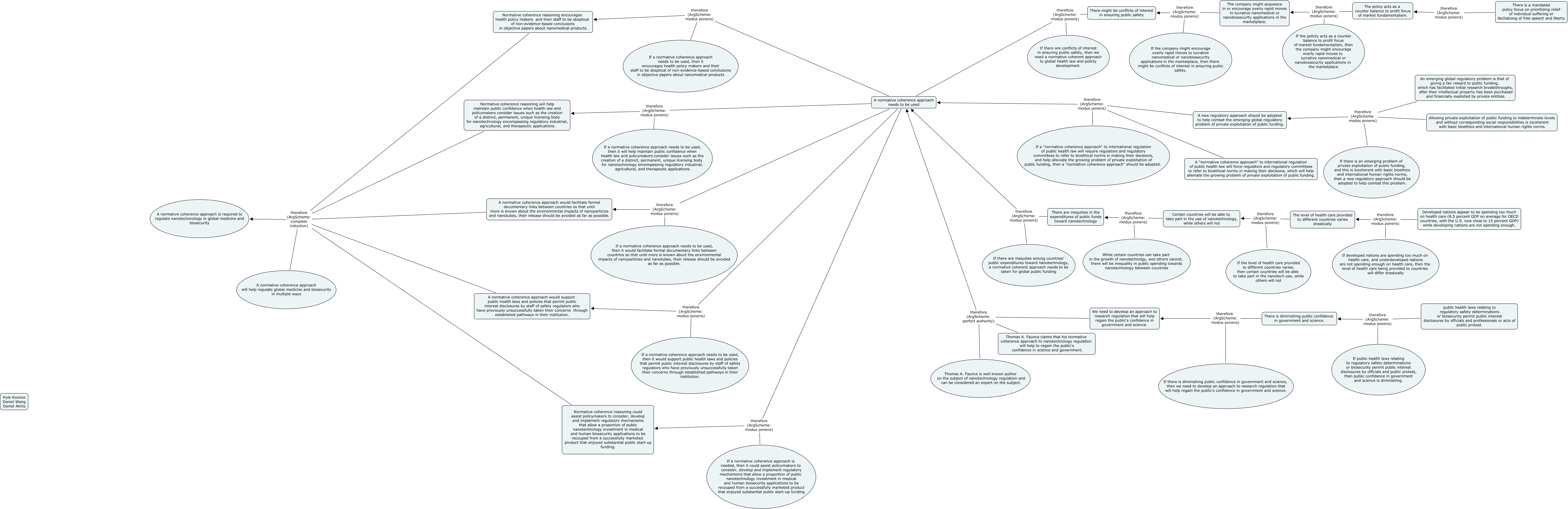 This Concept Map, created with IHMC CmapTools, has information related to: Nanotech dwang, The policy acts as a counter balance to profit focus of market fundamentalism. therefore (ArgScheme: modus ponens) If the policty acts as a counter balance to profit focus of market fundamentalism, then the company might encourage overly rapid moves to lucrative nanomedical or nanobiosecurity applications in the marketplace, A normative coherence approach would support public health laws and policies that permit public interest disclosures by staff of safety regulators who have previously unsuccessfully taken their concerns through established pathways in their institution. therefore (ArgScheme: complete induction) A normative coherence approach is required to regulate nanotechonology in global medicine and biosecurity, A normative coherence approach needs to be used therefore (ArgScheme: modus ponens) If a normative coherence approach needs to be used, then it will help maintain public confidence when health law and policymakers consider issues such as the creation of a distinct, permanent, unique licensing body for nanotechnology encompassing regulatory industrial, agricultural, and therapeutic applications., Normative coherence reasoning could assist policymakers to consider, develop and implement regulatory mechanisms that allow a proportion of public nanotechnology investment in medical and human biosecurity applications to be recouped from a successfully marketed product that enjoyed substantial public start-up funding. therefore (ArgScheme: complete induction) A normative coherence approach will help regulate global medicine and biosecurity in multiple ways, There are inequities in the expenditures of public funds toward nanotechnology therefore (ArgScheme: modus ponens) A normative coherence approach needs to be used, If there is diminishing public confidence in government and science, then we need to develop an approach to research regulation that will help regain the public's confidence in government and science. therefore (ArgScheme: modus ponens) We need to develop an approach to research regulation that will help regain the public's confidence in government and science., Thomas A. Faunce claims that his normative coherence approach to nanotechnology regulation will help to regain the public's confidence in science and government. therefore (ArgScheme: perfect authority) A normative coherence approach needs to be used, The level of health care provided to different countries varies drastically therefore (ArgScheme: modus ponens) Certain countries will be able to take part in the use of nanotechnology, while others will not, public health laws relating to regulatory safety determinations or biosecurity permit public interest disclosures by officials and professionals or acts of public protest. therefore (ArgScheme: modus ponens) There is diminishing public confidence in government and science., A normative coherence approach needs to be used therefore (ArgScheme: modus ponens) A normative coherence approach would support public health laws and policies that permit public interest disclosures by staff of safety regulators who have previously unsuccessfully taken their concerns through established pathways in their institution., A normative coherence approach needs to be used therefore (ArgScheme: modus ponens) If a normative coherence approach is needed, then it could assist policymakers to consider, develop and implement regulatory mechanisms that allow a proportion of public nanotechnology investment in medical and human biosecurity applications to be recouped from a successfully marketed product that enjoyed substantial public start-up funding, Developed nations appear to be spending too much on health care (8.5 percent GDP on average for OECD countries, with the U.S. now close to 15 percent GDP) while developing nations are not spending enough. therefore (ArgScheme: modus ponens) The level of health care provided to different countries varies drastically, Normative coherence reasoning will help maintain public confidence when health law and policymakers consider issues such as the creation of a distinct, permanent, unique licensing body for nanotechnology encompassing regulatory industrial, agricultural, and therapeutic applications. therefore (ArgScheme: complete induction) A normative coherence approach is required to regulate nanotechonology in global medicine and biosecurity, A normative coherence approach would facilitate formal documentary links between countries so that until more is known about the environmental impacts of nanoparticles and nanotubes, their release should be avoided as far as possible. therefore (ArgScheme: complete induction) A normative coherence approach is required to regulate nanotechonology in global medicine and biosecurity, A normative coherence approach needs to be used therefore (ArgScheme: modus ponens) Normative coherence reasoning will help maintain public confidence when health law and policymakers consider issues such as the creation of a distinct, permanent, unique licensing body for nanotechnology encompassing regulatory industrial, agricultural, and therapeutic applications., A normative coherence approach needs to be used therefore (ArgScheme: modus ponens) A normative coherence approach would facilitate formal documentary links between countries so that until more is known about the environmental impacts of nanoparticles and nanotubes, their release should be avoided as far as possible., A new regulatory approach should be adopted to help combat the emerging global regulatory problem of private exploitation of public funding. therefore (ArgScheme: modus ponens) A normative coherence approach needs to be used, Normative coherence reasoning encourages health policy makers and their staff to be skeptical of non-evidence-based conclusions in objective papers about nanomedical products. therefore (ArgScheme: complete induction) A normative coher