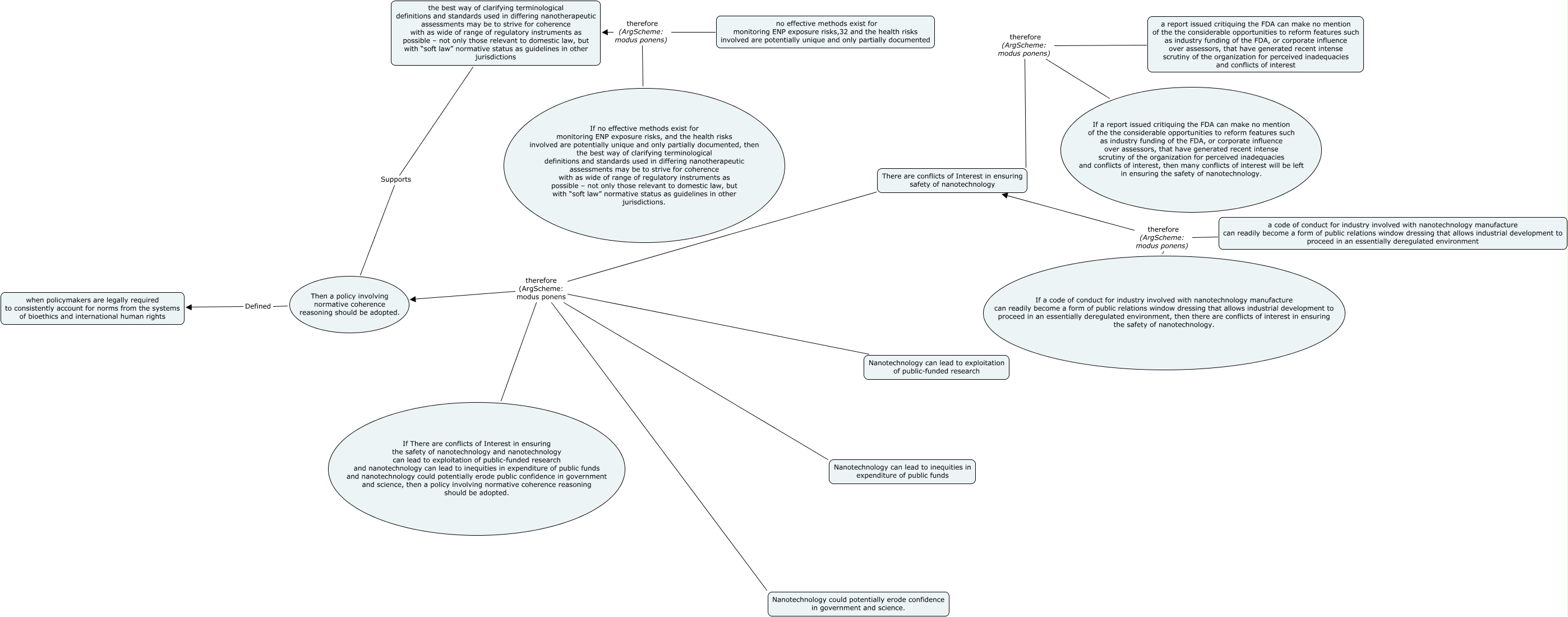 This Concept Map, created with IHMC CmapTools, has information related to: Basic CMAP with Michael's work, If a code of conduct for industry involved with nanotechnology manufacture can readily become a form of public relations window dressing that allows industrial development to proceed in an essentially deregulated environment, then there are conflicts of interest in ensuring the safety of nanotechnology. therefore (ArgScheme: modus ponens) There are conflicts of Interest in ensuring safety of nanotechnology, There are conflicts of Interest in ensuring safety of nanotechnology therefore (ArgScheme: modus ponens Then a policy involving normative coherence reasoning should be adopted., If a report issued critiquing the FDA can make no mention of the the considerable opportunities to reform features such as industry funding of the FDA, or corporate influence over assessors, that have generated recent intense scrutiny of the organization for perceived inadequacies and conflicts of interest, then many conflicts of interest will be left in ensuring the safety of nanotechnology. therefore (ArgScheme: modus ponens) There are conflicts of Interest in ensuring safety of nanotechnology, the best way of clarifying terminological definitions and standards used in differing nanotherapeutic assessments may be to strive for coherence with as wide of range of regulatory instruments as possible – not only those relevant to domestic law, but with “soft law” normative status as guidelines in other jurisdictions Supports Then a policy involving normative coherence reasoning should be adopted., Nanotechnology could potentially erode confidence in government and science. therefore (ArgScheme: modus ponens Then a policy involving normative coherence reasoning should be adopted., Nanotechnology can lead to exploitation of public-funded research therefore (ArgScheme: modus ponens Then a policy involving normative coherence reasoning should be adopted., If There are conflicts of Interest in ensuring the safety of nanotechnology and nanotechnology can lead to exploitation of public-funded research and nanotechnology can lead to inequities in expenditure of public funds and nanotechnology could potentially erode public confidence in government and science, then a policy involving normative coherence reasoning should be adopted. therefore (ArgScheme: modus ponens Then a policy involving normative coherence reasoning should be adopted., a code of conduct for industry involved with nanotechnology manufacture can readily become a form of public relations window dressing that allows industrial development to proceed in an essentially deregulated environment therefore (ArgScheme: modus ponens) There are conflicts of Interest in ensuring safety of nanotechnology, Then a policy involving normative coherence reasoning should be adopted. Defined when policymakers are legally required to consistently account for norms from the systems of bioethics and international human rights, If no effective methods exist for monitoring ENP exposure risks, and the health risks involved are potentially unique and only partially documented, then the best way of clarifying terminological definitions and standards used in differing nanotherapeutic assessments may be to strive for coherence with as wide of range of regulatory instruments as possible – not only those relevant to domestic law, but with “soft law” normative status as guidelines in other jurisdictions. therefore (ArgScheme: modus ponens) the best way of clarifying terminological definitions and standards used in differing nanotherapeutic assessments may be to strive for coherence with as wide of range of regulatory instruments as possible – not only those relevant to domestic law, but with “soft law” normative status as guidelines in other jurisdictions, Nanotechnology can lead to inequities in expenditure of public funds therefore (ArgScheme: modus ponens Then a policy involving normative coherence reasoning should be adopted., a report issued critiquing the FDA can make no mention of the the considerable opportunities to reform features such as industry funding of the FDA, or corporate influence over assessors, that have generated recent intense scrutiny of the organization for perceived inadequacies and conflicts of interest therefore (ArgScheme: modus ponens) There are conflicts of Interest in ensuring safety of nanotechnology, no effective methods exist for monitoring ENP exposure risks,32 and the health risks involved are potentially unique and only partially documented therefore (ArgScheme: modus ponens) the best way of clarifying terminological definitions and standards used in differing nanotherapeutic assessments may be to strive for coherence with as wide of range of regulatory instruments as possible – not only those relevant to domestic law, but with “soft law” normative status as guidelines in other jurisdictions