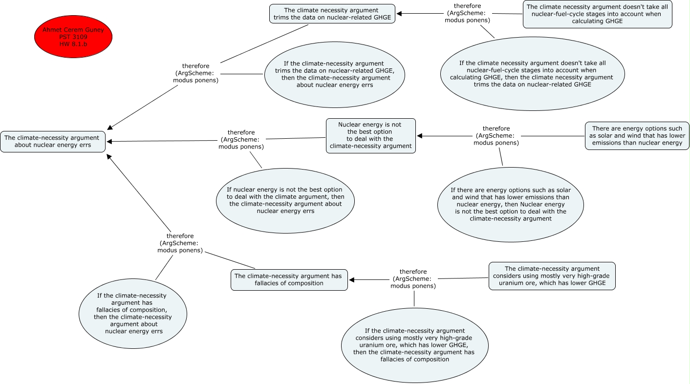 This Concept Map, created with IHMC CmapTools, has information related to: Cerem (JAY) global nuclear, If nuclear energy is not the best option to deal with the climate argument, then the climate-necessity argument about nuclear energy errs therefore (ArgScheme: modus ponens) The climate-necessity argument about nuclear energy errs, If there are energy options such as solar and wind that has lower emissions than nuclear energy, then Nuclear energy is not the best option to deal with the climate-necessity argument therefore (ArgScheme: modus ponens) Nuclear energy is not the best option to deal with the climate-necessity argument, If the climate-necessity argument has fallacies of composition, then the climate-necessity argument about nuclear energy errs therefore (ArgScheme: modus ponens) The climate-necessity argument about nuclear energy errs, If the climate-necessity argument considers using mostly very high-grade uranium ore, which has lower GHGE, then the climate-necessity argument has fallacies of composition therefore (ArgScheme: modus ponens) The climate-necessity argument has fallacies of composition, The climate-necessity argument has fallacies of composition therefore (ArgScheme: modus ponens) The climate-necessity argument about nuclear energy errs, The climate necessity argument doesn't take all nuclear-fuel-cycle stages into account when calculating GHGE therefore (ArgScheme: modus ponens) The climate necessity argument trims the data on nuclear-related GHGE, Nuclear energy is not the best option to deal with the climate-necessity argument therefore (ArgScheme: modus ponens) The climate-necessity argument about nuclear energy errs, If the climate-necessity argument trims the data on nuclear-related GHGE, then the climate-necessity argument about nuclear energy errs therefore (ArgScheme: modus ponens) The climate-necessity argument about nuclear energy errs, If the climate necessity argument doesn't take all nuclear-fuel-cycle stages into account when calculating GHGE, then the climate necessity argument trims the data on nuclear-related GHGE therefore (ArgScheme: modus ponens) The climate necessity argument trims the data on nuclear-related GHGE, There are energy options such as solar and wind that has lower emissions than nuclear energy therefore (ArgScheme: modus ponens) Nuclear energy is not the best option to deal with the climate-necessity argument, The climate-necessity argument considers using mostly very high-grade uranium ore, which has lower GHGE therefore (ArgScheme: modus ponens) The climate-necessity argument has fallacies of composition, The climate necessity argument trims the data on nuclear-related GHGE therefore (ArgScheme: modus ponens) The climate-necessity argument about nuclear energy errs