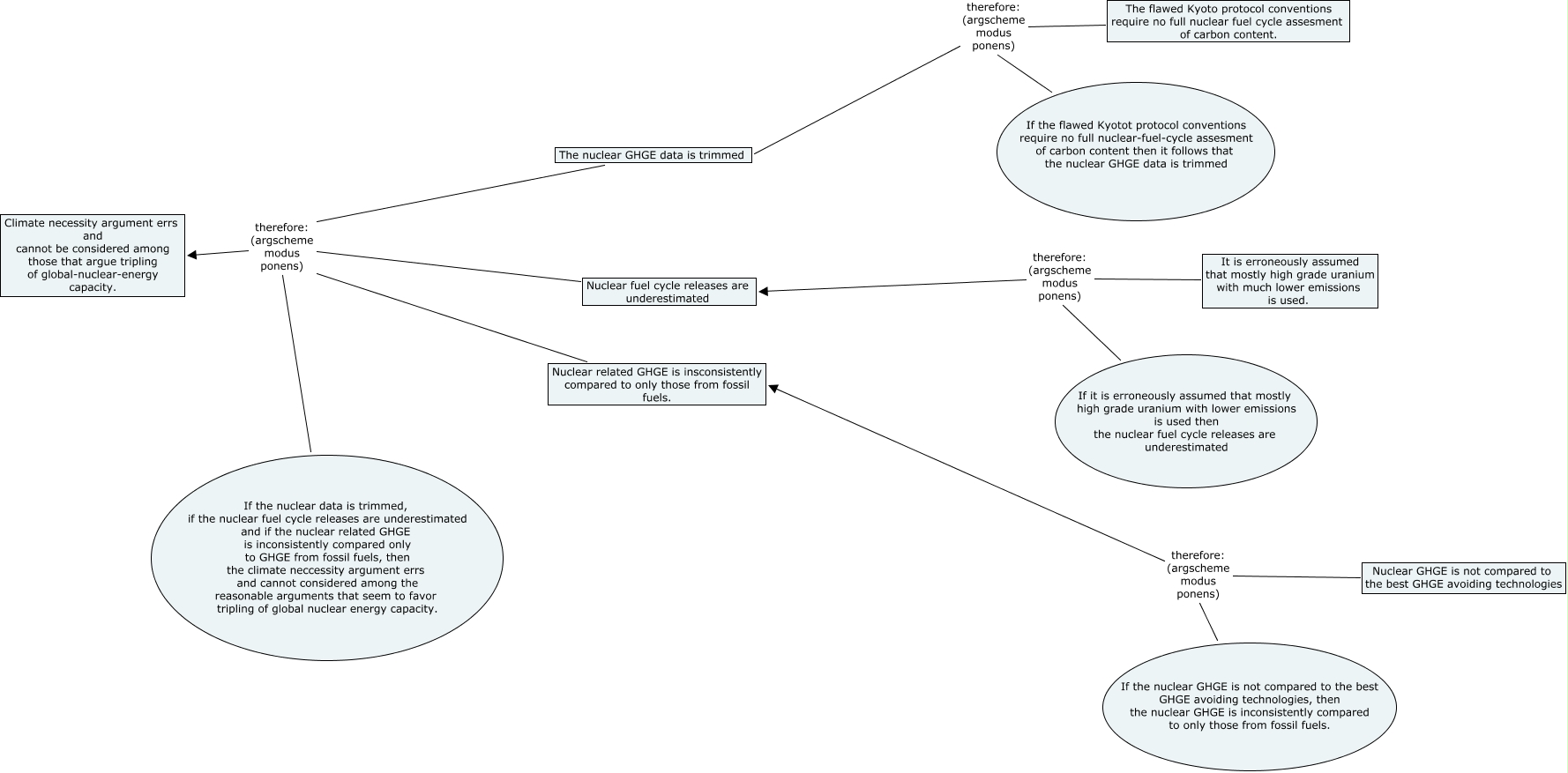 This Concept Map, created with IHMC CmapTools, has information related to: NuclearEnergy_Adnan, If the flawed Kyotot protocol conventions require no full nuclear-fuel-cycle assesment of carbon content then it follows that the nuclear GHGE data is trimmed therefore: (argscheme modus ponens) The nuclear GHGE data is trimmed, Nuclear related GHGE is insconsistently compared to only those from fossil fuels. therefore: (argscheme modus ponens) Climate necessity argument errs and cannot be considered among those that argue tripling of global-nuclear-energy capacity., Nuclear fuel cycle releases are underestimated therefore: (argscheme modus ponens) Climate necessity argument errs and cannot be considered among those that argue tripling of global-nuclear-energy capacity., The nuclear GHGE data is trimmed therefore: (argscheme modus ponens) Climate necessity argument errs and cannot be considered among those that argue tripling of global-nuclear-energy capacity., If the nuclear GHGE is not compared to the best GHGE avoiding technologies, then the nuclear GHGE is inconsistently compared to only those from fossil fuels. therefore: (argscheme modus ponens) Nuclear related GHGE is insconsistently compared to only those from fossil fuels., Nuclear GHGE is not compared to the best GHGE avoiding technologies therefore: (argscheme modus ponens) Nuclear related GHGE is insconsistently compared to only those from fossil fuels., It is erroneously assumed that mostly high grade uranium with much lower emissions is used. therefore: (argscheme modus ponens) Nuclear fuel cycle releases are underestimated, If it is erroneously assumed that mostly high grade uranium with lower emissions is used then the nuclear fuel cycle releases are underestimated therefore: (argscheme modus ponens) Nuclear fuel cycle releases are underestimated, If the nuclear data is trimmed, if the nuclear fuel cycle releases are underestimated and if the nuclear related GHGE is inconsistently compared only to GHGE from fossil fuels, then the climate neccessity argument errs and cannot considered among the reasonable arguments that seem to favor tripling of global nuclear energy capacity. therefore: (argscheme modus ponens) Climate necessity argument errs and cannot be considered among those that argue tripling of global-nuclear-energy capacity., The flawed Kyoto protocol conventions require no full nuclear fuel cycle assesment of carbon content. therefore: (argscheme modus ponens) The nuclear GHGE data is trimmed