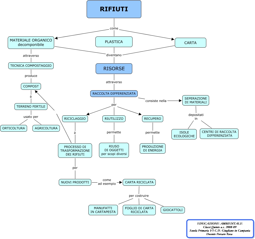 Questa Cmap, creata con IHMC CmapTools, contiene informazioni relative a: Il rifiuto diventa risorsa, CARTA diventano RISORSE, MATERIALE ORGANICO decomponibile attraverso TECNICA COMPOSTAGGIO, RIFIUTI come MATERIALE ORGANICO decomponibile, CARTA RICICLATA per costruire FOGLIO DI CARTA RICICLATA, NUOVI PRODOTTI come ad esempio CARTA RICICLATA, PLASTICA diventano RISORSE, PROCESSO DI TRASFORMAZIONE DEI RIFIUTI COMPOST, MATERIALE ORGANICO decomponibile diventano RISORSE, RIFIUTI come PLASTICA, PROCESSO DI TRASFORMAZIONE DEI RIFIUTI per NUOVI PRODOTTI, RACCOLTA DIFFERENZIATA consiste nella SEPERAZIONE DI MATERIALI, RIUTILIZZO permette RIUSO DI OGGETTI per scopi diversi, RACCOLTA DIFFERENZIATA per RIUTILIZZO, RISORSE attraverso RACCOLTA DIFFERENZIATA, TERRENO FERTILE usato per AGRICOLTURA, CARTA RICICLATA per costruire MANUFATTI IN CARTAPESTA, RIFIUTI come CARTA, RICICLAGGIO è PROCESSO DI TRASFORMAZIONE DEI RIFIUTI, TECNICA COMPOSTAGGIO produce COMPOST, SEPERAZIONE DI MATERIALI depositati in ISOLE ECOLOGICHE