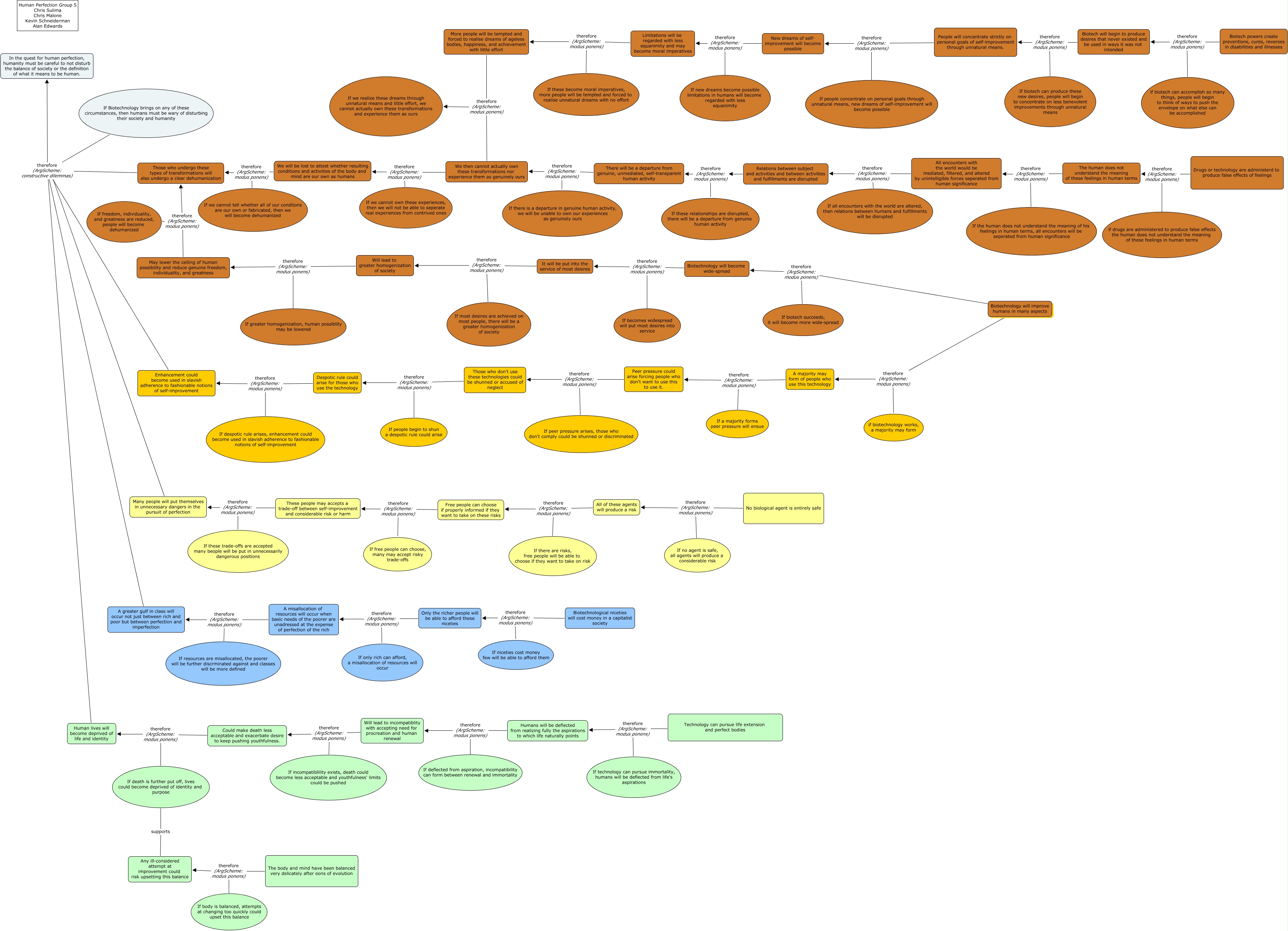 This Concept Map, created with IHMC CmapTools, has information related to: human perfection chris 7.9.09, Could make death less acceptable and exacerbate desire to keep pushing youthfulness. therefore (ArgScheme: modus ponens) Human lives will become deprived of life and identity, Humans will be deflected from realizing fully the aspirations to which life naturally points therefore (ArgScheme: modus ponens) If deflected from aspiration, incompatibility can form between renewal and immortality, Drugs or technology are administerd to produce false effects of feelings therefore (ArgScheme: modus ponens) if drugs are administered to produce false effects the human does not understand the meaning of these feelings in human terms, No biological agent is entirely safe therefore (ArgScheme: modus ponens) All of these agents will produce a risk, A misallocation of resources will occur when basic needs of the poorer are unadressed at the expense of perfection of the rich therefore (ArgScheme: modus ponens) A greater gulf in class will occur not just between rich and poor but between perfection and imperfection, Many people will put themselves in unnecessary dangers in the pursuit of perfection therefore (ArgScheme: constructive dilemmas) In the quest for human perfection, humanity must be careful to not disturb the balance of society or the definition of what it means to be human., The human does not understand the meaning of these feelings in human terms therefore (ArgScheme: modus ponens) If the human does not understand the meaning of his feelings in human terms, all encounters will be seperated from human significance, Technology can pursue life extension and perfect bodies therefore (ArgScheme: modus ponens) If technology can pursue immortality, humans will be deflected from life's aspirations, Those who undergo these types of transformations will also undergo a clear dehumanization therefore (ArgScheme: constructive dilemmas) If Biotechnology brings on any of these circumstances, then humans must be wary of disturbing their society and humanity, Those who don't use these technologies could be shunned or accused of neglect therefore (ArgScheme: modus ponens) If people begin to shun a despotic rule could arise, Will lead to greater homogenization of society therefore (ArgScheme: modus ponens) May lower the ceiling of human possibility and reduce genuine freedom, individuality, and greatness, The human does not understand the meaning of these feelings in human terms therefore (ArgScheme: modus ponens) All encounters with the world would be mediated, filtered, and altered by unintelligible forces seperated from human significance, Could make death less acceptable and exacerbate desire to keep pushing youthfulness. therefore (ArgScheme: modus ponens) If death is further put off, lives could become deprived of identity and purpose, A greater gulf in class will occur not just between rich and poor but between perfection and imperfection therefore (ArgScheme: constructive dilemmas) If Biotechnology brings on any of these circumstances, then humans must be wary of disturbing their society and humanity, The body and mind have been balanced very delicately after eons of evolution therefore (ArgScheme: modus ponens) If body is balanced, attempts at changing too quickly could upset this balance, A misallocation of resources will occur when basic needs of the poorer are unadressed at the expense of perfection of the rich therefore (ArgScheme: modus ponens) If resources are misallocated, the poorer will be further discrminated against and classes will be more defined, Humans will be deflected from realizing fully the aspirations to which life naturally points therefore (ArgScheme: modus ponens) Will lead to incompatiblity with accepting need for procreation and human renewal, New dreams of self- improvement will become possible therefore (ArgScheme: modus ponens) Limitations will be regarded with less equanimity and may become moral imperatives, All of these agents will produce a risk therefore (ArgScheme: modus ponens) If there are risks, free people will be able to choose if they want to take on risk, Limitations will be regarded with less equanimity and may become moral imperatives therefore (ArgScheme: modus ponens) More people will be tempted and forced to realise dreams of ageless bodies, happiness, and achievement with little effort