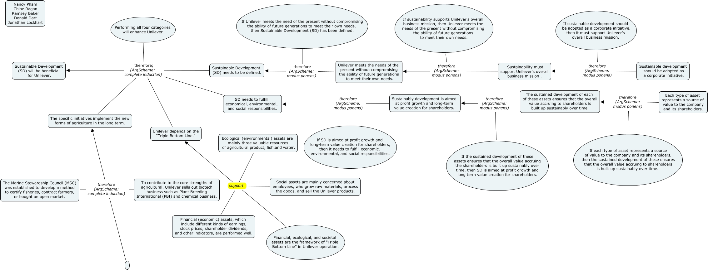This Concept Map, created with IHMC CmapTools, has information related to: food production, The Marine Stewardship Council (MSC) was established to develop a method to certify fisheries, contract farmers, or bought on open market. therefore (ArgScheme: complete induction) To contribute to the core strengths of agricultural, Unilever sells out biotech business such as Plant Breeding International (PBI) and chemical business., Sustainably development is aimed at profit growth and long-term value creation for shareholders. therefore (ArgScheme: modus ponens) SD needs to fulfill economical, environmental, and social responsibilities., If the sustained development of these assets ensures that the overall value accruing the shareholders is built up sustainably over time, then SD is aimed at profit growth and long term value creation for shareholders. therefore (ArgScheme: modus ponens) Sustainably development is aimed at profit growth and long-term value creation for shareholders., Each type of asset represents a source of value to the company and its shareholders. therefore (ArgScheme: modus ponens) The sustained development of each of these assets ensures that the overall value accruing to shareholders is built up sustainably over time., The Marine Stewardship Council (MSC) was established to develop a method to certify fisheries, contract farmers, or bought on open market. therefore (ArgScheme: complete induction) The specific initiatives implement the new forms of agriculture in the long term., therefore (ArgScheme: complete induction) The specific initiatives implement the new forms of agriculture in the long term., therefore (ArgScheme: complete induction) To contribute to the core strengths of agricultural, Unilever sells out biotech business such as Plant Breeding International (PBI) and chemical business., The sustained development of each of these assets ensures that the overall value accruing to shareholders is built up sustainably over time. therefore (ArgScheme: modus ponens) Sustainably development is aimed at profit growth and long-term value creation for shareholders., If sustainability supports Unilever's overall business mission, then Unilever meets the needs of the present without compromising the ability of future generations to meet their own needs. therefore (ArgScheme: modus ponens) Unilever meets the needs of the present without compromising the ability of future generations to meet their own needs., Sustainability must support Unilever's overall business mission . therefore (ArgScheme: modus ponens) Unilever meets the needs of the present without compromising the ability of future generations to meet their own needs., If sustainable development should be adopted as a corporate initiative, then it must support Unilever's overall business mission. therefore (ArgScheme: modus ponens) Sustainability must support Unilever's overall business mission ., If SD is aimed at profit growth and long-term value creation for shareholders, then it needs to fulfill economic, environmental, and social responsibilities. therefore (ArgScheme: modus ponens) SD needs to fulfill economical, environmental, and social responsibilities., If each type of asset represents a source of value to the company and its shareholders, then the sustained development of these ensures that the overall value accruing to shareholders is built up sustainably over time. therefore (ArgScheme: modus ponens) The sustained development of each of these assets ensures that the overall value accruing to shareholders is built up sustainably over time., Sustainable development should be adopted as a corporate initiative. therefore (ArgScheme: modus ponens) Sustainability must support Unilever's overall business mission .