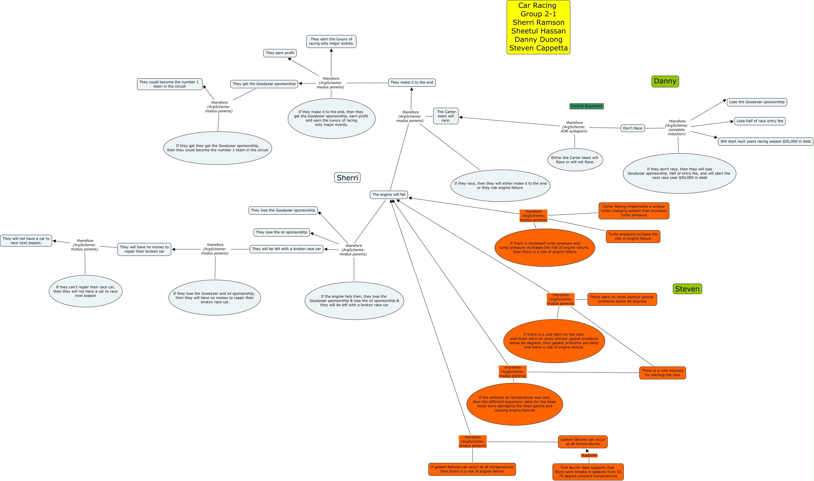 This Concept Map, created with IHMC CmapTools, has information related to: Group Map Updated 7-13 8pm, They will be left with a broken race car therefore (ArgScheme: modus ponens) They will have no money to repair their broken car, There is a cold morning for starting the race therefore (ArgScheme: modus ponens) The engine will fail, They make it to the end therefore (ArgScheme: modus ponens) They earn profit, Turbo pressure increase the risk of engine failure therefore (ArgScheme: modus ponens) The engine will fail, If they can't repair their race car, then they will not have a car to race next season therefore (ArgScheme: modus ponens) They will not have a car to race next season., The Carter team will race. therefore (ArgScheme: modus ponens) They make it to the end, If they race, then they will either make it to the end or they risk engine failure. therefore (ArgScheme: modus ponens) The engine will fail, The engine will fail therefore (ArgScheme: modus ponens) They will be left with a broken race car, They get the Goodyear sponsorship therefore (ArgScheme: modus ponens) If they get they get the Goodyear sponsorship, then they could become the number 1 team in the circuit, The Carter team will race. therefore (ArgScheme: modus ponens) The engine will fail, If the engine fails then, they lose the Goodyear sponsorship & lose the oil sponsorship & they will be left with a broken race car therefore (ArgScheme: modus ponens) They lose the Goodyear sponsorship, Don't Race therefore (ArgScheme: complete induction) Lose half of race entry fee, If the engine fails then, they lose the Goodyear sponsorship & lose the oil sponsorship & they will be left with a broken race car therefore (ArgScheme: modus ponens) They will be left with a broken race car, If they make it to the end, then they get the Goodyear sponsorship, earn profit and earn the luxury of racing only major events. therefore (ArgScheme: modus ponens) They get the Goodyear sponsorship, Carter Racing implements a unique turbo charging system that increases turbo pressure therefore (ArgScheme: modus ponens) The engine will fail, They make it to the end therefore (ArgScheme: modus ponens) They get the Goodyear sponsorship, If they race, then they will either make it to the end or they risk engine failure. therefore (ArgScheme: modus ponens) They make it to the end, Tom Burns' data supports that there were breaks in gaskets from 53 75 degree ambient temperatures Supports Gasket failures can occur at all temperatures, The engine will fail therefore (ArgScheme: modus ponens) They lose the oil sponsorship, If gasket failures can occur at all temperatures then there is a risk of engine failure therefore (ArgScheme: modus ponens) The engine will fail