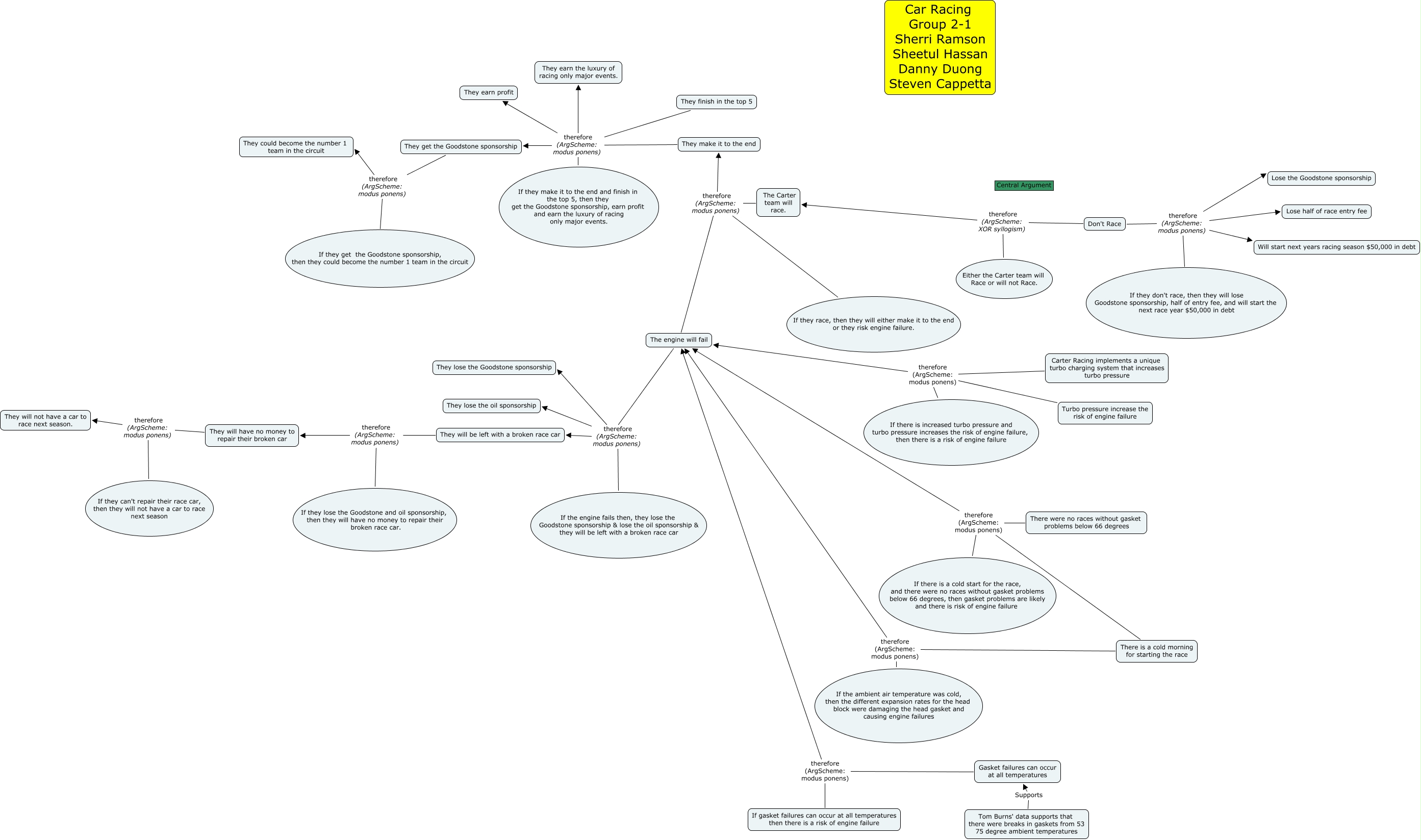 This Concept Map, created with IHMC CmapTools, has information related to: Group Map Updated 7-13 9pm, They finish in the top 5 therefore (ArgScheme: modus ponens) They earn profit, Turbo pressure increase the risk of engine failure therefore (ArgScheme: modus ponens) The engine will fail, They make it to the end therefore (ArgScheme: modus ponens) They earn profit, There is a cold morning for starting the race therefore (ArgScheme: modus ponens) The engine will fail, They will be left with a broken race car therefore (ArgScheme: modus ponens) They will have no money to repair their broken car, The Carter team will race. therefore (ArgScheme: modus ponens) They make it to the end, If they can't repair their race car, then they will not have a car to race next season therefore (ArgScheme: modus ponens) They will not have a car to race next season., If they race, then they will either make it to the end or they risk engine failure. therefore (ArgScheme: modus ponens) The engine will fail, The engine will fail therefore (ArgScheme: modus ponens) They will be left with a broken race car, They finish in the top 5 therefore (ArgScheme: modus ponens) They earn the luxury of racing only major events., If the engine fails then, they lose the Goodstone sponsorship & lose the oil sponsorship & they will be left with a broken race car therefore (ArgScheme: modus ponens) They lose the Goodstone sponsorship, The Carter team will race. therefore (ArgScheme: modus ponens) The engine will fail, They get the Goodstone sponsorship therefore (ArgScheme: modus ponens) If they get the Goodstone sponsorship, then they could become the number 1 team in the circuit, Don't Race therefore (ArgScheme: modus ponens) Lose half of race entry fee, If the engine fails then, they lose the Goodstone sponsorship & lose the oil sponsorship & they will be left with a broken race car therefore (ArgScheme: modus ponens) They will be left with a broken race car, Carter Racing implements a unique turbo charging system that increases turbo pressure therefore (ArgScheme: modus ponens) The engine will fail, If they make it to the end and finish in the top 5, then they get the Goodstone sponsorship, earn profit and earn the luxury of racing only major events. therefore (ArgScheme: modus ponens) They get the Goodstone sponsorship, Tom Burns' data supports that there were breaks in gaskets from 53 75 degree ambient temperatures Supports Gasket failures can occur at all temperatures, If they race, then they will either make it to the end or they risk engine failure. therefore (ArgScheme: modus ponens) They make it to the end, They make it to the end therefore (ArgScheme: modus ponens) They get the Goodstone sponsorship