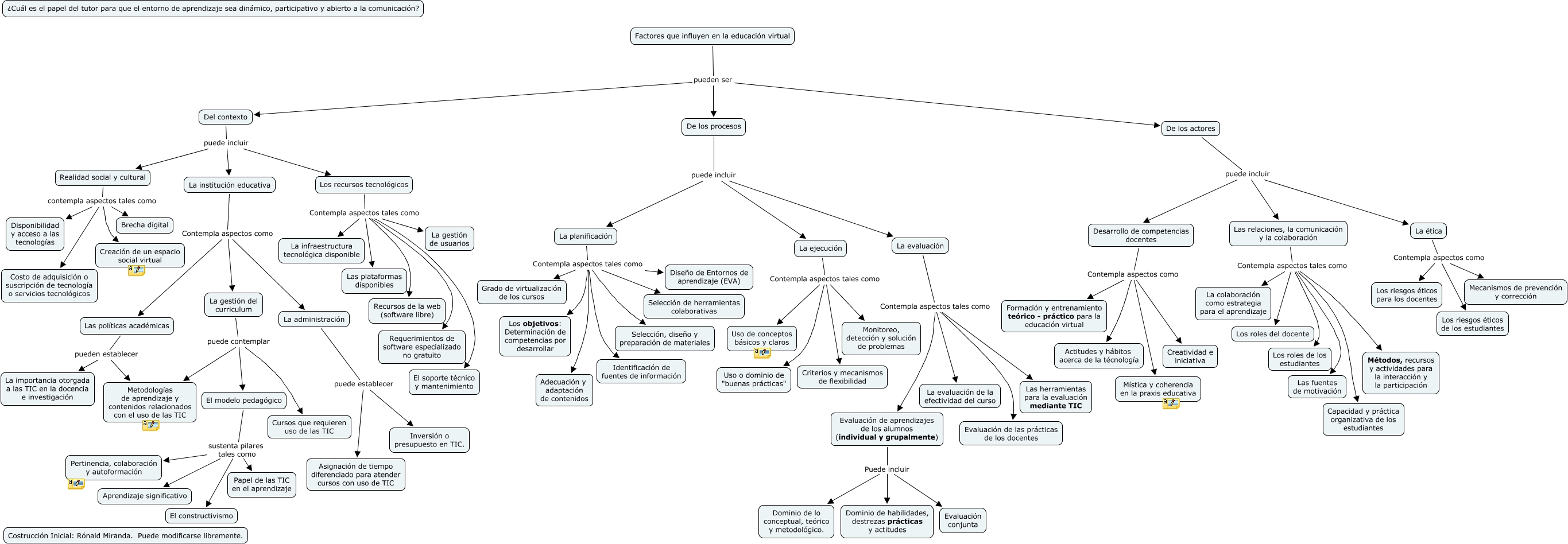 Este Cmap, tiene información relacionada con: Factores de la educación virtual, Desarrollo de competencias docentes Contempla aspectos como Mística y coherencia en la praxis educativa, Realidad social y cultural contempla aspectos tales como Creación de un espacio social virtual, La ejecución Contempla aspectos tales como Uso o dominio de "buenas prácticas", De los actores puede incluir Desarrollo de competencias docentes, Las relaciones, la comunicación y la colaboración Contempla aspectos tales como Las fuentes de motivación, Los recursos tecnológicos Contempla aspectos tales como El soporte técnico y mantenimiento, La ejecución Contempla aspectos tales como Monitoreo, detección y solución de problemas, Factores que influyen en la educación virtual pueden ser De los procesos, La planificación Contempla aspectos tales como Selección, diseño y preparación de materiales, La planificación Contempla aspectos tales como Grado de virtualización de los cursos, La gestión del curriculum puede contemplar Cursos que requieren uso de las TIC, La ética Contempla aspectos como Los riesgos éticos de los estudiantes, La gestión del curriculum puede contemplar Metodologías de aprendizaje y contenidos relacionados con el uso de las TIC, La planificación Contempla aspectos tales como Los objetivos: Determinación de competencias por desarrollar, Las políticas académicas pueden establecer Metodologías de aprendizaje y contenidos relacionados con el uso de las TIC, La evaluación Contempla aspectos tales como Evaluación de aprendizajes de los alumnos (individual y grupalmente), El modelo pedagógico sustenta pilares tales como Aprendizaje significativo, De los procesos puede incluir La evaluación, El modelo pedagógico sustenta pilares tales como El constructivismo, La ejecución Contempla aspectos tales como Uso de conceptos básicos y claros