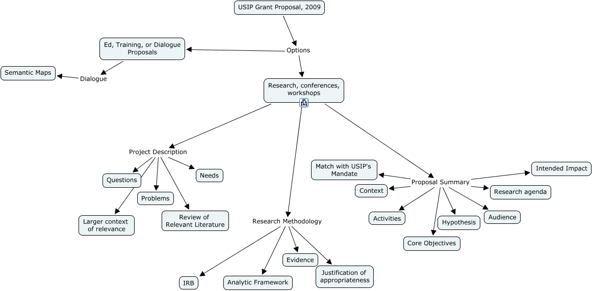 This Concept Map, created with IHMC CmapTools, has information related to: USIP_outline, Research, conferences, workshops Research Methodology Justification of appropriateness, Research, conferences, workshops Project Description Review of Relevant Literature, Research, conferences, workshops Project Description Larger context of relevance, Research, conferences, workshops Proposal Summary Audience, Research, conferences, workshops Proposal Summary Core Objectives, Research, conferences, workshops Proposal Summary Match with USIP's Mandate, Ed, Training, or Dialogue Proposals Dialogue Semantic Maps, Research, conferences, workshops Project Description Problems, Research, conferences, workshops Project Description Needs, Research, conferences, workshops Proposal Summary Activities, Research, conferences, workshops Research Methodology Evidence, Research, conferences, workshops Proposal Summary Intended Impact, Research, conferences, workshops Research Methodology Analytic Framework, Research, conferences, workshops Proposal Summary Hypothesis, Research, conferences, workshops Project Description Questions, Research, conferences, workshops Proposal Summary Research agenda, Research, conferences, workshops Proposal Summary Context, USIP Grant Proposal, 2009 Options Ed, Training, or Dialogue Proposals, USIP Grant Proposal, 2009 Options Research, conferences, workshops, Research, conferences, workshops Research Methodology IRB