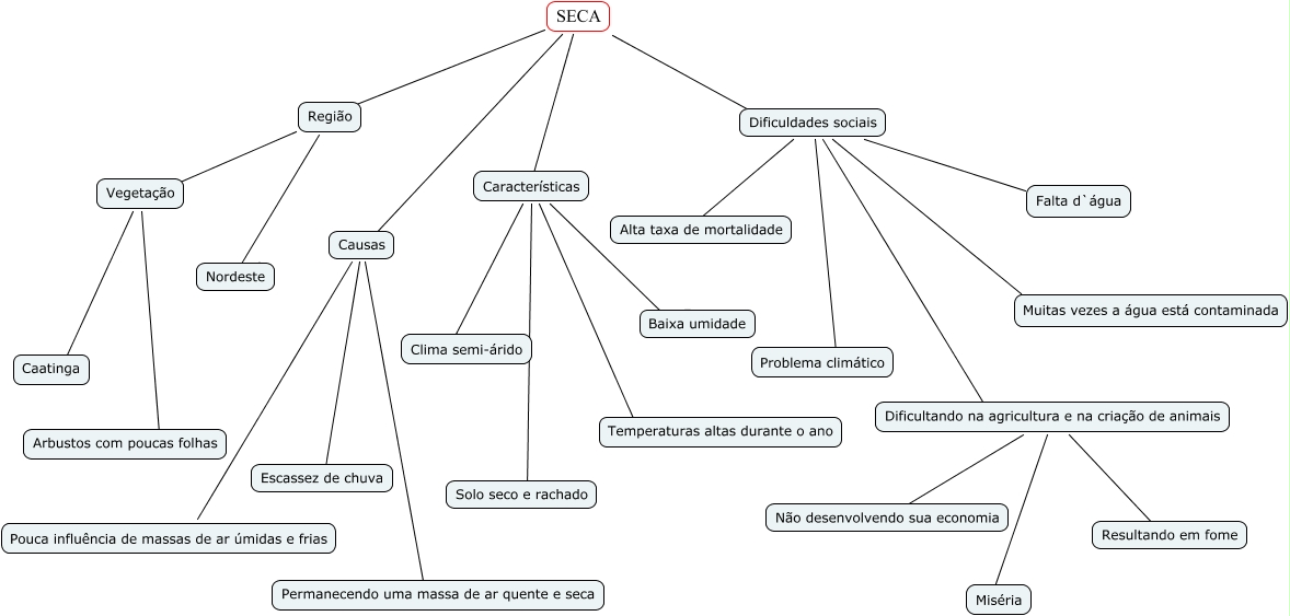 Esse mapa conceitual, produzido no IHMC CmapTools, tem a informação relacionada a: Nordeste, Dificultando na agricultura e na criação de animais ???? Miséria, Região ???? Vegetação, Características b Baixa umidade, Causas ???? Escassez de chuva, Região ???? Nordeste, Vegetação ???? Caatinga, SECA Região Região, Dificultando na agricultura e na criação de animais ???? Resultando em fome, Vegetação ???? Arbustos com poucas folhas, Dificuldades sociais ???? Problema climático, Dificultando na agricultura e na criação de animais b Não desenvolvendo sua economia, Características ???? Solo seco e rachado, Dificuldades sociais ???? Falta d`água, Características ???? Clima semi-árido, Dificuldades sociais ???? Dificultando na agricultura e na criação de animais, Causas Pouca influência das massas de ar Pouca influência de massas de ar úmidas e frias, SECA b Dificuldades sociais, SECA Causas Causas, Características ???? Temperaturas altas durante o ano, Dificuldades sociais ???? Alta taxa de mortalidade
