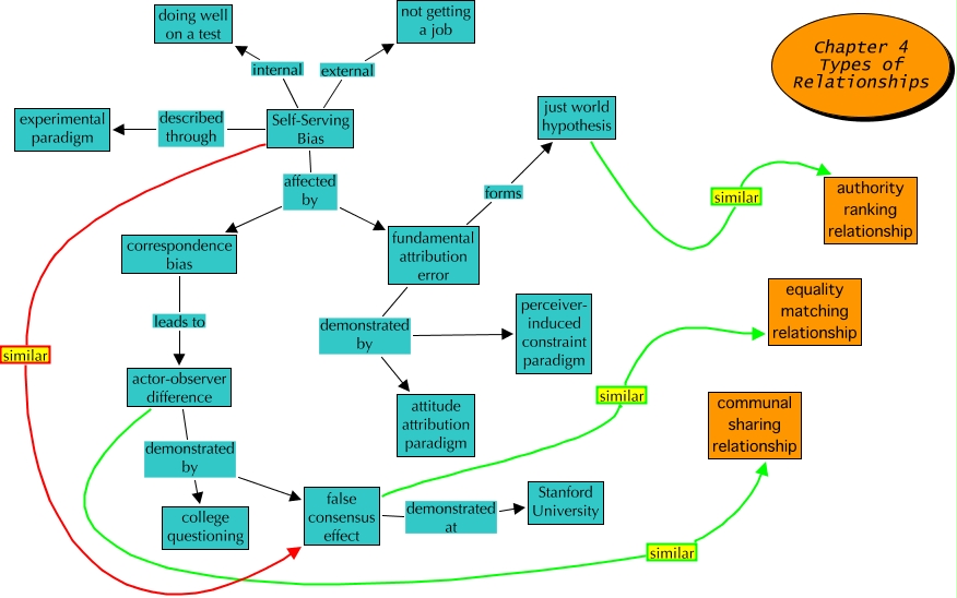 This Concept Map, created with IHMC CmapTools, has information related to: FINAL, Self-Serving Bias affected by correspondence bias, false consensus effect demonstrated at Stanford University, Self-Serving Bias internal doing well on a test, actor-observer difference similar communal sharing relationship, Self-Serving Bias described through experimental paradigm, actor-observer difference demonstrated by college questioning, just world hypothesis similar authority ranking relationship, Self-Serving Bias affected by fundamental attribution error, fundamental attribution error forms just world hypothesis, false consensus effect similar equality matching relationship, correspondence bias leads to actor-observer difference, fundamental attribution error demonstrated by attitude attribution paradigm, fundamental attribution error demonstrated by perceiver- induced constraint paradigm, Self-Serving Bias similar false consensus effect, actor-observer difference demonstrated by false consensus effect, Self-Serving Bias external not getting a job