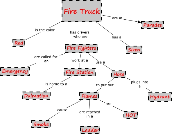 This Concept Map, created with IHMC CmapTools, has information related to: Fire Truck, Flames cause Smoke, Flames are reached in a Ladder, Fire Truck has drivers who are Fire Fighters, Fire Truck are in Parades, Fire Fighters are called for an Emergency, Hose plugs into a Hydrant, Hose to put out Flames, Fire Station is home to a Dalmation, Fire Truck has a Siren, Flames are HOT, Fire Fighters use a Hose, Fire Fighters work at a Fire Station, Fire Truck is the color Red