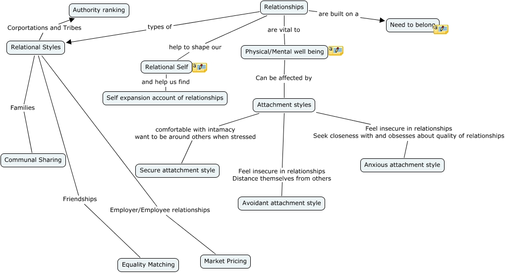 This Concept Map, created with IHMC CmapTools, has information related to: Relationships, Relational Styles Friendships Equality Matching, Attachment styles comfortable with intamacy want to be around others when stressed Secure attatchment style, Relationships help to shape our Relational Self, Relationships are vital to Physical/Mental well being, Relationships types of Relational Styles, Relational Styles Employer/Employee relationships Market Pricing, Attachment styles Feel insecure in relationships Distance themselves from others Avoidant attachment style, Attachment styles Feel insecure in relationships Seek closeness with and obsesses about quality of relationships Anxious attachment style, Physical/Mental well being Can be affected by Attachment styles, Relational Self and help us find Self expansion account of relationships, Relationships are built on a Need to belong, Relational Styles Corportations and Tribes Authority ranking, Relational Styles Families Communal Sharing