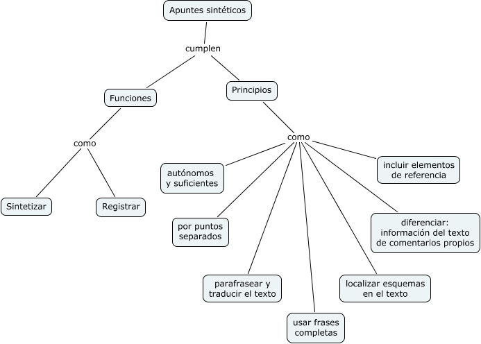 Este Cmap, tiene información relacionada con: apuntes sintéticos, Principios como autónomos y suficientes, Apuntes sintéticos cumplen Principios, incluir elementos de referencia como autónomos y suficientes, Funciones como Registrar, incluir elementos de referencia como diferenciar: información del texto de comentarios propios, Principios como parafrasear y traducir el texto, Principios como usar frases completas, incluir elementos de referencia como usar frases completas, Principios como por puntos separados, Funciones como Sintetizar, incluir elementos de referencia como localizar esquemas en el texto, Principios como localizar esquemas en el texto, incluir elementos de referencia como por puntos separados, Apuntes sintéticos cumplen Funciones, incluir elementos de referencia como parafrasear y traducir el texto, Principios como diferenciar: información del texto de comentarios propios