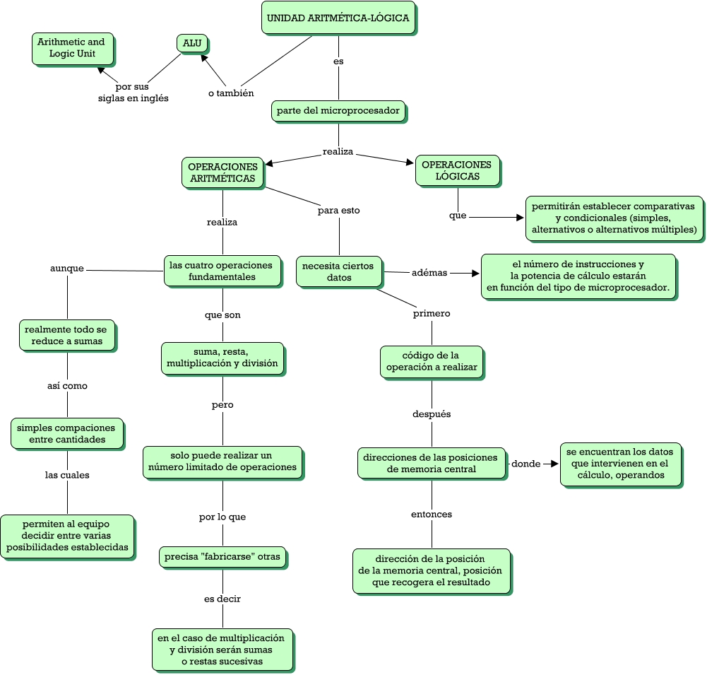 Este Cmap, tiene información relacionada con: Unidad Aritmética-Lógica 1, OPERACIONES ARITMÉTICAS para esto necesita ciertos datos, las cuatro operaciones fundamentales aunque realmente todo se reduce a sumas, las cuatro operaciones fundamentales que son suma, resta, multiplicación y división, UNIDAD ARITMÉTICA-LÓGICA es parte del microprocesador, parte del microprocesador realiza OPERACIONES LÓGICAS, OPERACIONES ARITMÉTICAS realiza las cuatro operaciones fundamentales, código de la operación a realizar después direcciones de las posiciones de memoria central, ALU por sus siglas en inglés Arithmetic and Logic Unit, solo puede realizar un número limitado de operaciones por lo que precisa "fabricarse" otras, OPERACIONES LÓGICAS que permitirán establecer comparativas y condicionales (simples, alternativos o alternativos múltiples), direcciones de las posiciones de memoria central donde se encuentran los datos que intervienen en el cálculo, operandos, UNIDAD ARITMÉTICA-LÓGICA o también ALU, direcciones de las posiciones de memoria central entonces dirección de la posición de la memoria central, posición que recogera el resultado, realmente todo se reduce a sumas así como simples compaciones entre cantidades, simples compaciones entre cantidades las cuales permiten al equipo decidir entre varias posibilidades establecidas, necesita ciertos datos primero código de la operación a realizar, suma, resta, multiplicación y división pero solo puede realizar un número limitado de operaciones, precisa "fabricarse" otras es decir en el caso de multiplicación y división serán sumas o restas sucesivas, necesita ciertos datos adémas el número de instrucciones y la potencia de cálculo estarán en función del tipo de microprocesador., parte del microprocesador realiza OPERACIONES ARITMÉTICAS