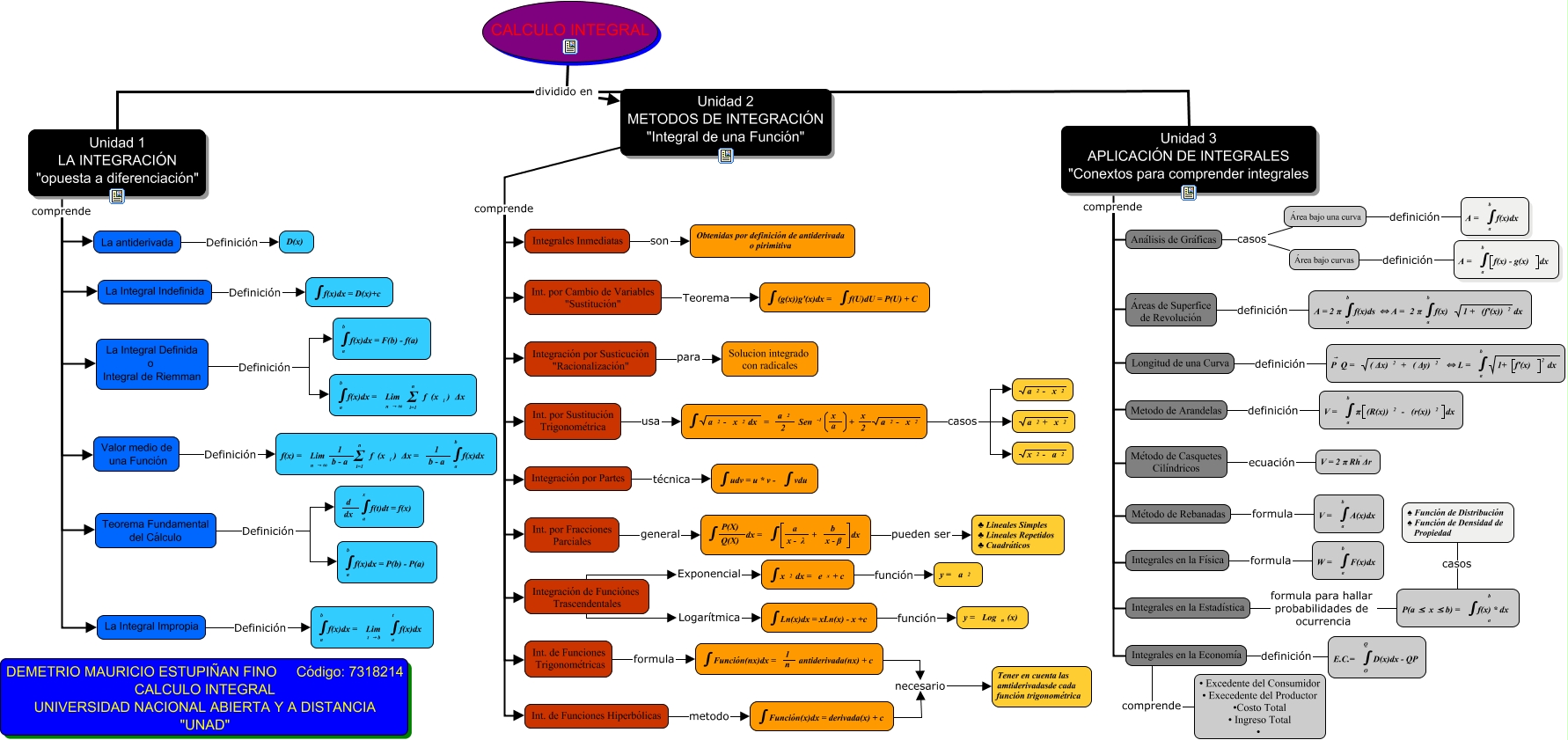 Esse mapa conceitual, produzido no IHMC CmapTools, tem a informação relacionada a: Calculo Integral, Integrales en la Economía comprende • Excedente del Consumidor • Execedente del Productor •Costo Total • Ingreso Total •, Unidad 1 LA INTEGRACIÓN "opuesta a diferenciación" comprende La antiderivada, Integrales en la Economía definición <math xmlns="http://www.w3.org/1998/Math/MathML"> <mrow> <mtext> E.C.= </mtext> <munderover> <int/> <mtext> O </mtext> <mtext> Q </mtext> </munderover> <mtext> D(x)dx - QP </mtext> </mrow> </math>, <math xmlns="http://www.w3.org/1998/Math/MathML"> <mrow> <int/> <mtext> Ln(x)dx = xLn(x) - x +c </mtext> </mrow> </math> función <math xmlns="http://www.w3.org/1998/Math/MathML"> <mrow> <mtext> y = </mtext> <mmultiscripts> <mtext> Log </mtext> <mtext> n </mtext> <none/> </mmultiscripts> <mtext> (x) </mtext> </mrow> </math>, Integrales en la Estadística formula para hallar probabilidades de ocurrencia <math xmlns="http://www.w3.org/1998/Math/MathML"> <mrow> <mtext> P(a≤ x≤ b) = </mtext> <munderover> <mrow> <int/> <mtext> f(x) * dx </mtext> </mrow> <mtext> a </mtext> <mtext> b </mtext> </munderover> </mrow> </math>, <math xmlns="http://www.w3.org/1998/Math/MathML"> <mrow> <int/> <mtext> Función(nx)dx = </mtext> <mfrac> <mtext> 1 </mtext> <mtext> n </mtext> </mfrac> <mtext> antiderivada(nx) + c </mtext> </mrow> </math> necesario Tener en cuenta las amtiderivadasde cada función trigonométrica, Int. por Cambio de Variables "Sustitución" Teorema <math xmlns="http://www.w3.org/1998/Math/MathML"> <mrow> <int/> <mtext> (g(x))g'(x)dx = </mtext> <int/> <mtext> f(U)dU = P(U) + C </mtext> </mrow> </math>, La antiderivada Definición D(x), Unidad 1 LA INTEGRACIÓN "opuesta a diferenciación" comprende Valor medio de una Función, <math xmlns="http://www.w3.org/1998/Math/MathML"> <mrow> <int/> <mfrac> <mtext> P(X) </mtext> <mtext> Q(X) </mtext> </mfrac> <mtext> dx = </mtext> <int/> <mfenced open="[" close="]"> <mfrac> <mtext> a </mtext> <mtext> x - λ </mtext> </mfrac> <mtext> + </mtext> <mfrac> <mtext> b </mtext> <mtext> x -β </mtext> </mfrac> </mfenced> <mtext> dx </mtext> </mrow> </math> pueden ser ♣ Lineales Simples ♣ Lineales Repetidos ♣ Cuadráticos, Integración de Funciónes Trascendentales Logarítmica <math xmlns="http://www.w3.org/1998/Math/MathML"> <mrow> <int/> <mtext> Ln(x)dx = xLn(x) - x +c </mtext> </mrow> </math>, Unidad 3 APLICACIÓN DE INTEGRALES "Conextos para comprender integrales comprende Integrales en la Economía, Int. de Funciones Hiperbólicas metodo <math xmlns="http://www.w3.org/1998/Math/MathML"> <mrow> <int/> <mtext> Función(x)dx = derivada(x) + c </mtext> </mrow> </math>, Unidad 1 LA INTEGRACIÓN "opuesta a diferenciación" comprende Teorema Fundamental del Cálculo, Valor medio de una Función Definición <math xmlns="http://www.w3.org/1998/Math/MathML"> <mrow> <mtext> f(x) = </mtext> <munderover> <mtext> Lim </mtext> <mtext> n → ∞ </mtext> <none/> </munderover> <mfrac> <mtext> 1 </mtext> <mtext> b - a </mtext> </mfrac> <munderover> <sum/> <mtext> i=1 </mtext> <mtext> n </mtext> </munderover> <mtext> f </mtext> <mmultiscripts> <mtext> (x </mtext> <mtext> i </mtext> <none/> </mmultiscripts> <mtext> ) Δx = </mtext> <mfrac> <mtext> 1 </mtext> <mtext> b - a </mtext> </mfrac> <munderover> <int/> <mtext> a </mtext> <mtext> b </mtext> </munderover> <mtext> f(x)dx </mtext> </mrow> </math>, <math xmlns="http://www.w3.org/1998/Math/MathML"> <mrow> <int/> <msqrt> <mrow> <mmultiscripts> <mtext> a </mtext> <none/> <mtext> 2 </mtext> </mmultiscripts> <mtext> - </mtext> <mmultiscripts> <mtext> x </mtext> <none/> <mtext> 2 </mtext> </mmultiscripts> <mtext> dx </mtext> </mrow> </msqrt> <mtext> = </mtext> <mfrac> <mmultiscripts> <mtext> a </mtext> <none/> <mtext> 2 </mtext> </mmultiscripts> <mtext> 2 </mtext> </mfrac> <mtext> </mtext> <mmultiscripts> <mtext> Sen </mtext> <none/> <mtext> -1 </mtext> </mmultiscripts> <mfenced open="(" close=")"> <mfrac> <mtext> x </mtext> <mtext> a </mtext> </mfrac> </mfenced> <mtext> + </mtext> <mfrac> <mtext> x </mtext> <mtext> 2 </mtext> </mfrac> <msqrt> <mrow> <mmultiscripts> <mtext> a </mtext> <none/> <mtext> 2 </mtext> </mmultiscripts> <mtext> - </mtext> <mmultiscripts> <mtext> x </mtext> <none/> <mtext> 2 </mtext> </mmultiscripts> </mrow> </msqrt> </mrow> </math> casos <math xmlns="http://www.w3.org/1998/Math/MathML"> <mrow> <msqrt> <mrow> <mmultiscripts> <mtext> a </mtext> <none/> <mtext> 2 </mtext> </mmultiscripts> <mtext> + </mtext> <mmultiscripts> <mtext> x </mtext> <none/> <mtext> 2 </mtext> </mmultiscripts> </mrow> </msqrt> </mrow> </math>, CALCULO INTEGRAL dividido en Unidad 2 METODOS DE INTEGRACIÓN "Integral de una Función", Unidad 3 APLICACIÓN DE INTEGRALES "Conextos para comprender integrales comprende Longitud de una Curva, Unidad 2 METODOS DE INTEGRACIÓN "Integral de una Función" comprende Integración por Susticución "Racionalización", <math xmlns="http://www.w3.org/1998/Math/MathML"> <mrow> <mtext> La Integral Definida