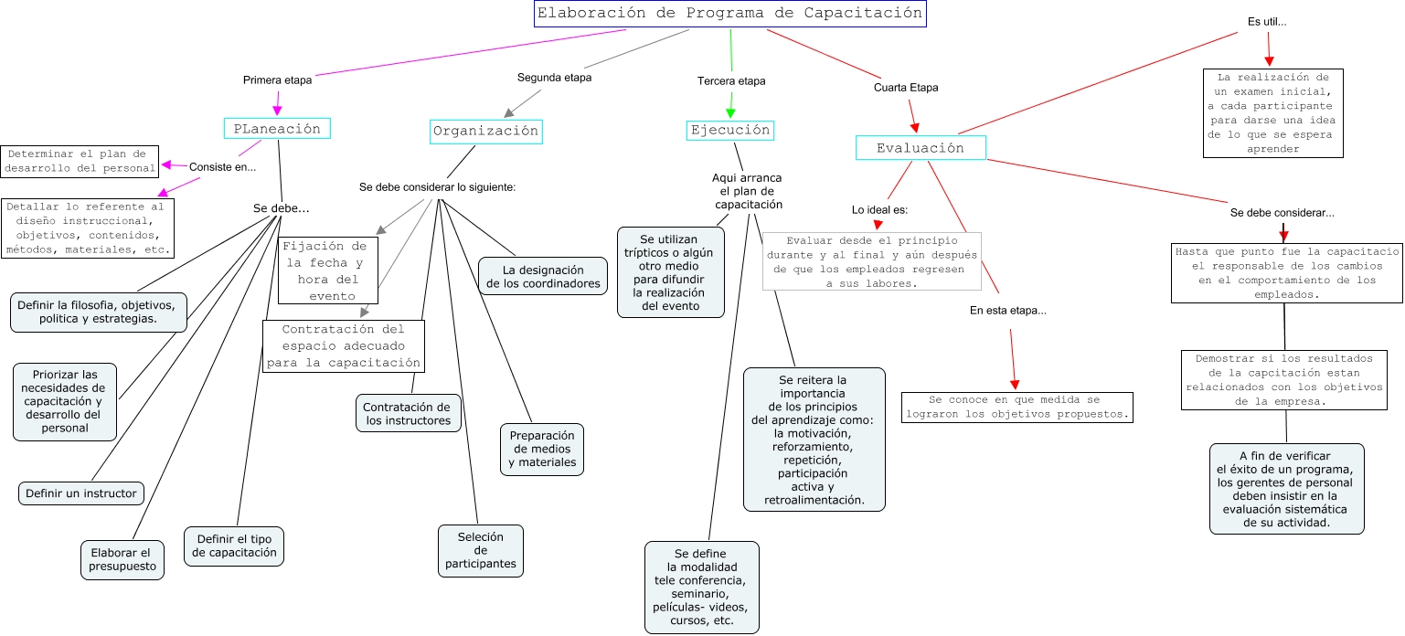 Este Cmap, tiene información relacionada con: agua_CALIDADOK, Organización Se debe considerar lo siguiente: Fijación de la fecha y hora del evento, PLaneación Se debe... Priorizar las necesidades de capacitación y desarrollo del personal, PLaneación Consiste en... Determinar el plan de desarrollo del personal, PLaneación Consiste en... Detallar lo referente al diseño instruccional, objetivos, contenidos, métodos, materiales, etc., Elaborar el presupuesto Se debe... Definir la filosofia, objetivos, politica y estrategias., Elaboración de Programa de Capacitación Tercera etapa Ejecución, Ejecución Aqui arranca el plan de capacitación Se utilizan trípticos o algún otro medio para difundir la realización del evento, PLaneación Se debe... Definir la filosofia, objetivos, politica y estrategias., Preparación de medios y materiales Se debe considerar lo siguiente: Contratación del espacio adecuado para la capacitación, Evaluación Se debe considerar... Hasta que punto fue la capacitacio el responsable de los cambios en el comportamiento de los empleados., Evaluación Lo ideal es: Evaluar desde el principio durante y al final y aún después de que los empleados regresen a sus labores., A fin de verificar el éxito de un programa, los gerentes de personal deben insistir en la evaluación sistemática de su actividad. Se debe considerar... Hasta que punto fue la capacitacio el responsable de los cambios en el comportamiento de los empleados., Se define la modalidad tele conferencia, seminario, películas- videos, cursos, etc. Aqui arranca el plan de capacitación Se utilizan trípticos o algún otro medio para difundir la realización del evento, Organización Se debe considerar lo siguiente: Contratación del espacio adecuado para la capacitación, La designación de los coordinadores Se debe considerar lo siguiente: Fijación de la fecha y hora del evento, Definir un instructor Se debe... Definir la filosofia, objetivos, politica y estrategias., Preparación de medios y materiales Se debe considerar lo siguiente: Fijación de la fecha y hora del evento, Contratación de los instructores Se debe considerar lo siguiente: Contratación del espacio adecuado para la capacitación, Elaboración de Programa de Capacitación Primera etapa PLaneación, Definir el tipo de capacitación Se debe... Definir la filosofia, objetivos, politica y estrategias.