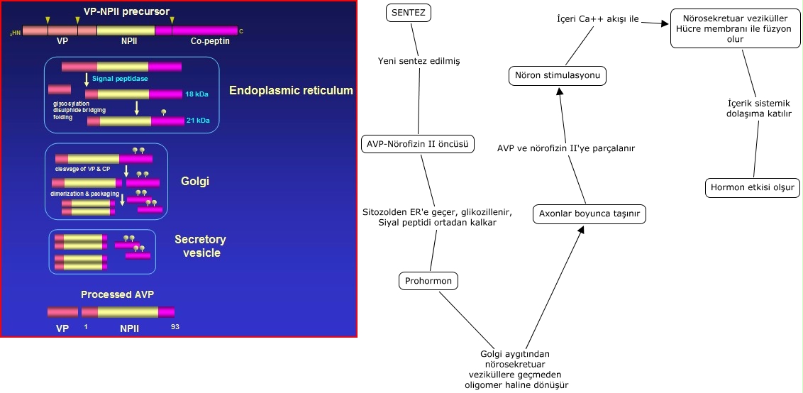 Bu Kavram Haritasının içerdiği bilgi: Nöronlarda AVP Sentez Bamakları, Nörosekretuar veziküller Hücre membranı ile füzyon olur İçerik sistemik dolaşıma katılır Hormon etkisi olşur, SENTEZ Yeni sentez edilmiş AVP-Nörofizin II öncüsü, Prohormon Golgi aygıtından nörosekretuar veziküllere geçmeden oligomer haline dönüşür Axonlar boyunca taşınır, Nöron stimulasyonu İçeri Ca++ akışı ile Nörosekretuar veziküller Hücre membranı ile füzyon olur, Axonlar boyunca taşınır AVP ve nörofizin II'ye parçalanır Nöron stimulasyonu, AVP-Nörofizin II öncüsü Sitozolden ER'e geçer, glikozillenir, Siyal peptidi ortadan kalkar Prohormon
