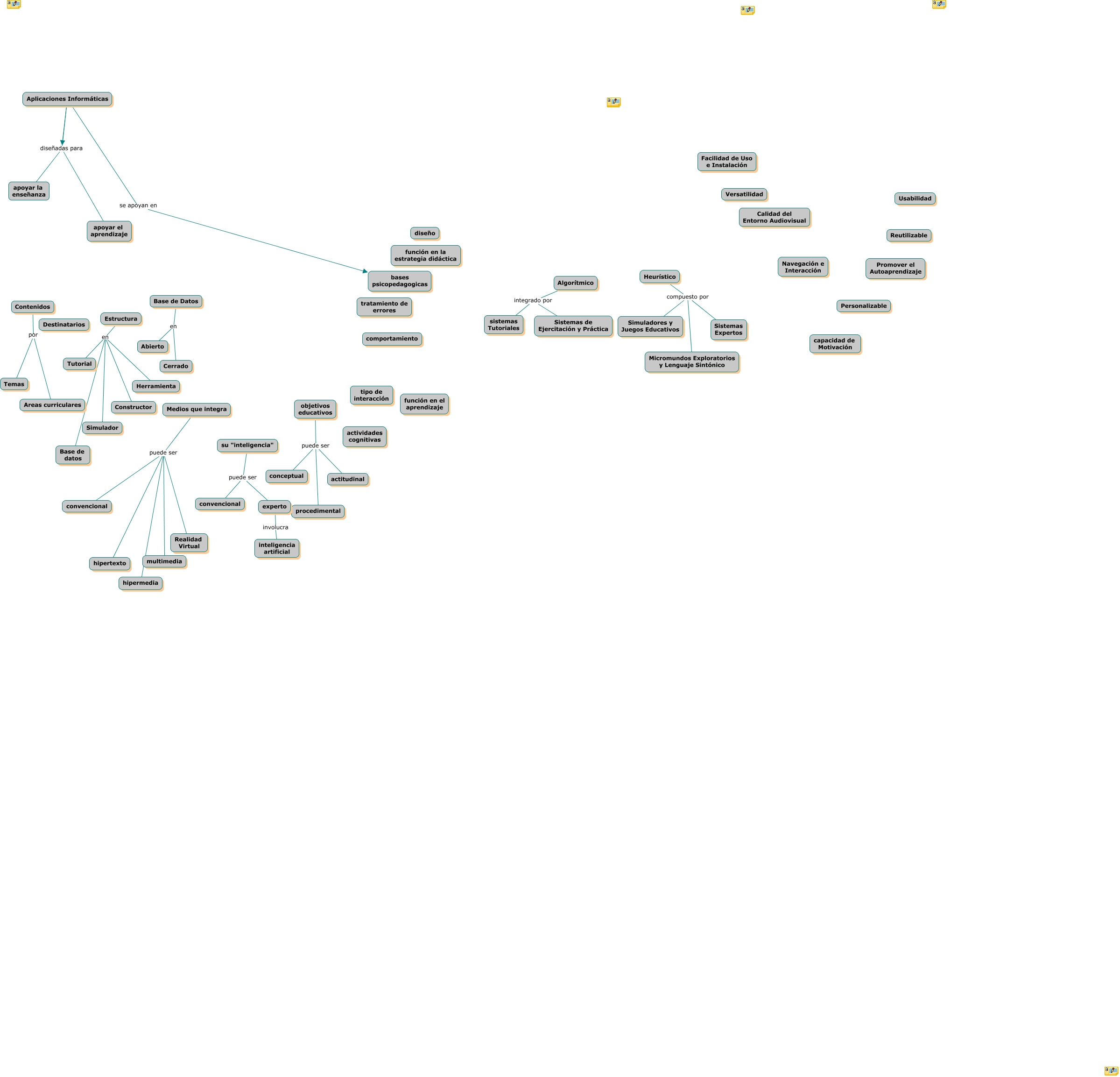 Este Cmap, tiene información relacionada con: Software Educativo MECs, Aplicaciones Informáticas diseñadas para apoyar el aprendizaje, Algorítmico integrado por sistemas Tutoriales, Aplicaciones Informáticas diseñadas para apoyar el aprendizaje, Contenidos por Temas, Estructura en Tutorial, su "inteligencia" puede ser experto, Estructura en Simulador, objetivos educativos puede ser conceptual, Aplicaciones Informáticas diseñadas para apoyar la enseñanza, Algorítmico integrado por Sistemas de Ejercitación y Práctica, Medios que integra puede ser hipermedia, Heurístico compuesto por Simuladores y Juegos Educativos, su "inteligencia" puede ser convencional, Base de Datos en Cerrado, Estructura en Base de datos, Medios que integra puede ser hipertexto, Medios que integra puede ser Realidad Virtual, objetivos educativos puede ser procedimental, Estructura en Constructor, Base de Datos en Abierto