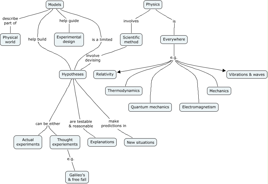 This Concept Map, created with IHMC CmapTools, has information related to: Holt - chapter 1-1-2, Everywhere e.g. Relativity, Everywhere e.g. Mechanics, Hypotheses are testable & reasonable Explanations, Models help build Hypotheses, Everywhere e.g. Vibrations & waves, Everywhere e.g. Thermodynamics, Models help guide Experimental design, Everywhere e.g. Electromagnetism, Physics is Everywhere, Scientific method involve devising Hypotheses, Hypotheses can be either Thought experiements, Models is a limited Hypotheses, Thought experiements e.g. Galileo's & free fall, Hypotheses make predictions in New situations, Hypotheses can be either Actual experiments, Physics involves Scientific method, Everywhere e.g. Quantum mechanics, Models describe part of Physical world