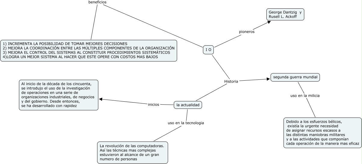Este Cmap, tiene información relacionada con: IO-equipo 4, la actualidad uso en la tecnologia La revolución de las computadoras. Así las técnicas mas complejas estuvieron al alcance de un gran numero de personas, I O beneficios 1) INCREMENTA LA POSIBILIDAD DE TOMAR MEJORES DECISIONES 2) MEJORA LA COORDINACIÓN ENTRE LAS MÚLTIPLES COMPONENTES DE LA ORGANIZACIÓN 3) MEJORA EL CONTROL DEL SISTEMAS AL CONSTITUIR PROCEDIMIENTOS SISTEMÁTICOS 4)LOGRA UN MEJOR SISTEMA AL HACER QUE ESTE OPERE CON COSTOS MAS BAJOS, I O pioneros George Dantzig y Rusell L. Ackoff, la actualidad inicios Al inicio de la década de los cincuenta, se introdujo el uso de la investigación de operaciones en una serie de organizaciones industriales, de negocios y del gobierno. Desde entonces, se ha desarrollado con rapidez, segunda guerra mundial uso en la milicia Debido a los esfuerzos bélicos, existía la urgente necesidad de asignar recursos escasos a las distintas maniobras militares y a las actividades que componían cada operación de la manera mas eficaz, I O Historia segunda guerra mundial, I O Historia la actualidad