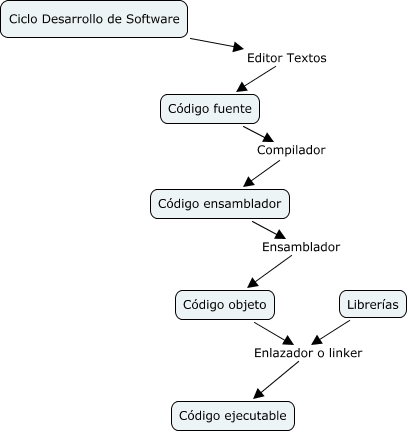 Este Cmap, tiene información relacionada con: CicloDesarrolloSoftware, Código ensamblador Ensamblador Código objeto, Código fuente Compilador Código ensamblador, Código objeto Enlazador o linker Código ejecutable, Ciclo Desarrollo de Software Editor Textos Código fuente, Librerías Enlazador o linker Código ejecutable
