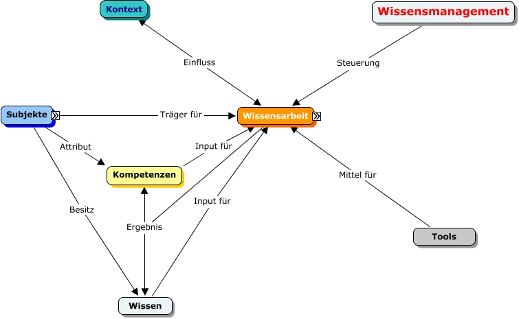 Dieses mit IHMC CmapTools erstellte CMap hat Informationen bezüglich: WM-Modell, Wissensarbeit Ergebnis Kompetenzen, Subjekte Träger für Wissensarbeit, Subjekte Besitz Wissen, Wissensmanagement Steuerung Wissensarbeit, Netzwerke Teil Unternehmen, Kompetenzen Input für Wissensarbeit, Netzwerke Teil Projekte, Tools Mittel für Wissensarbeit, Subjekte Attribut Kompetenzen, Wissen Input für Wissensarbeit, Wissensarbeit Ergebnis Wissen, Organisationen Teil Wissensarbeiter