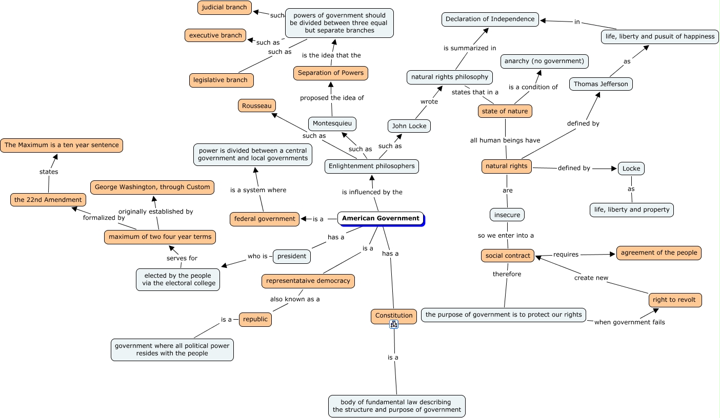 This Concept Map, created with IHMC CmapTools, has information related to: American Government, Enlightenment philosophers such as Montesquieu, powers of government should be divided between three equal but separate branches such as legislative branch, republic is a government where all political power resides with the people, John Locke wrote natural rights philosophy, American Government is influenced by the Enlightenment philosophers, elected by the people via the electoral college serves for maximum of two four year terms, powers of government should be divided between three equal but separate branches such as judicial branch, social contract requires agreement of the people, federal government is a system where power is divided between a central government and local governments, social contract therefore the purpose of government is to protect our rights, the purpose of government is to protect our rights when government fails right to revolt, Montesquieu proposed the idea of Separation of Powers, Constitution is a body of fundamental law describing the structure and purpose of government, president who is elected by the people via the electoral college, state of nature all human beings have natural rights, right to revolt create new social contract, natural rights are insecure, insecure so we enter into a social contract, natural rights defined by Thomas Jefferson, the 22nd Amendment states The Maximum is a ten year sentence