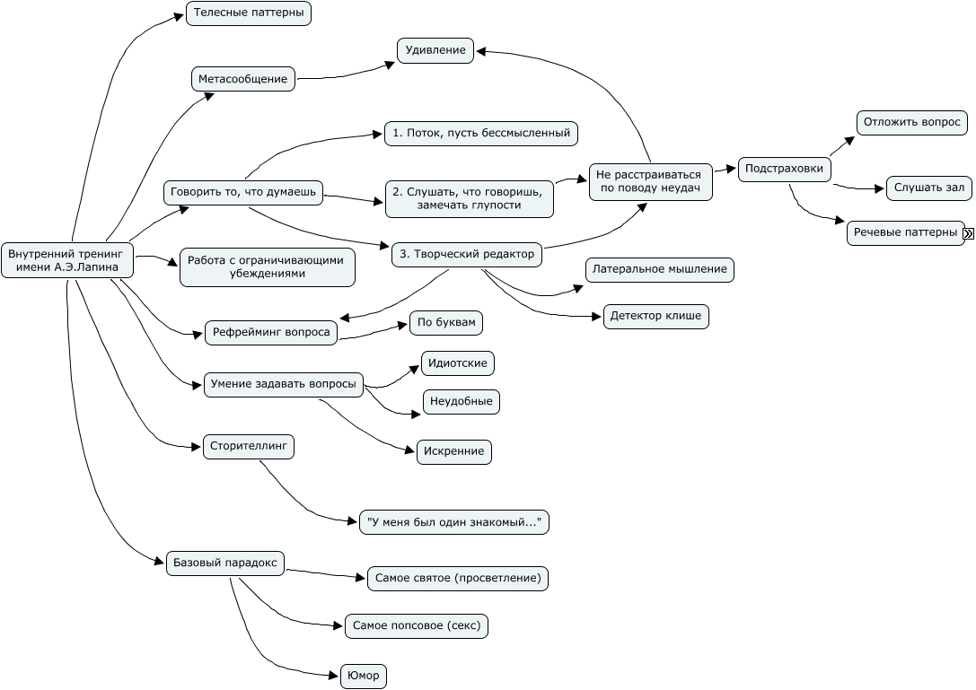 This Concept Map, created with IHMC CmapTools, has information related to: Внутренний тренинг имени Лапина, Умение задавать вопросы Идиотские, 3. Творческий редактор Латеральное мышление, Речевые паттерны "Славик, ты это вырежи потом", Подстраховки Речевые паттерны, Сторителлинг "У меня был один знакомый...", 2. Слушать, что говоришь, замечать глупости Не расстраиваться по поводу неудач, 3. Творческий редактор Детектор клише, Умение задавать вопросы Неудобные, Речевые паттерны "Надеюсь, вы понимаете, потому что сам-то я не очень понимаю", Внутренний тренинг имени А.Э.Лапина Метасообщение, 3. Творческий редактор Не расстраиваться по поводу неудач, Внутренний тренинг имени А.Э.Лапина Умение задавать вопросы, Внутренний тренинг имени А.Э.Лапина Базовый парадокс, Внутренний тренинг имени А.Э.Лапина Телесные паттерны, Говорить то, что думаешь 1. Поток, пусть бессмысленный, Внутренний тренинг имени А.Э.Лапина Рефрейминг вопроса, Внутренний тренинг имени А.Э.Лапина Работа с ограничивающими убеждениями, Внутренний тренинг имени А.Э.Лапина Говорить то, что думаешь, Базовый парадокс Самое святое (просветление), Внутренний тренинг имени А.Э.Лапина Сторителлинг