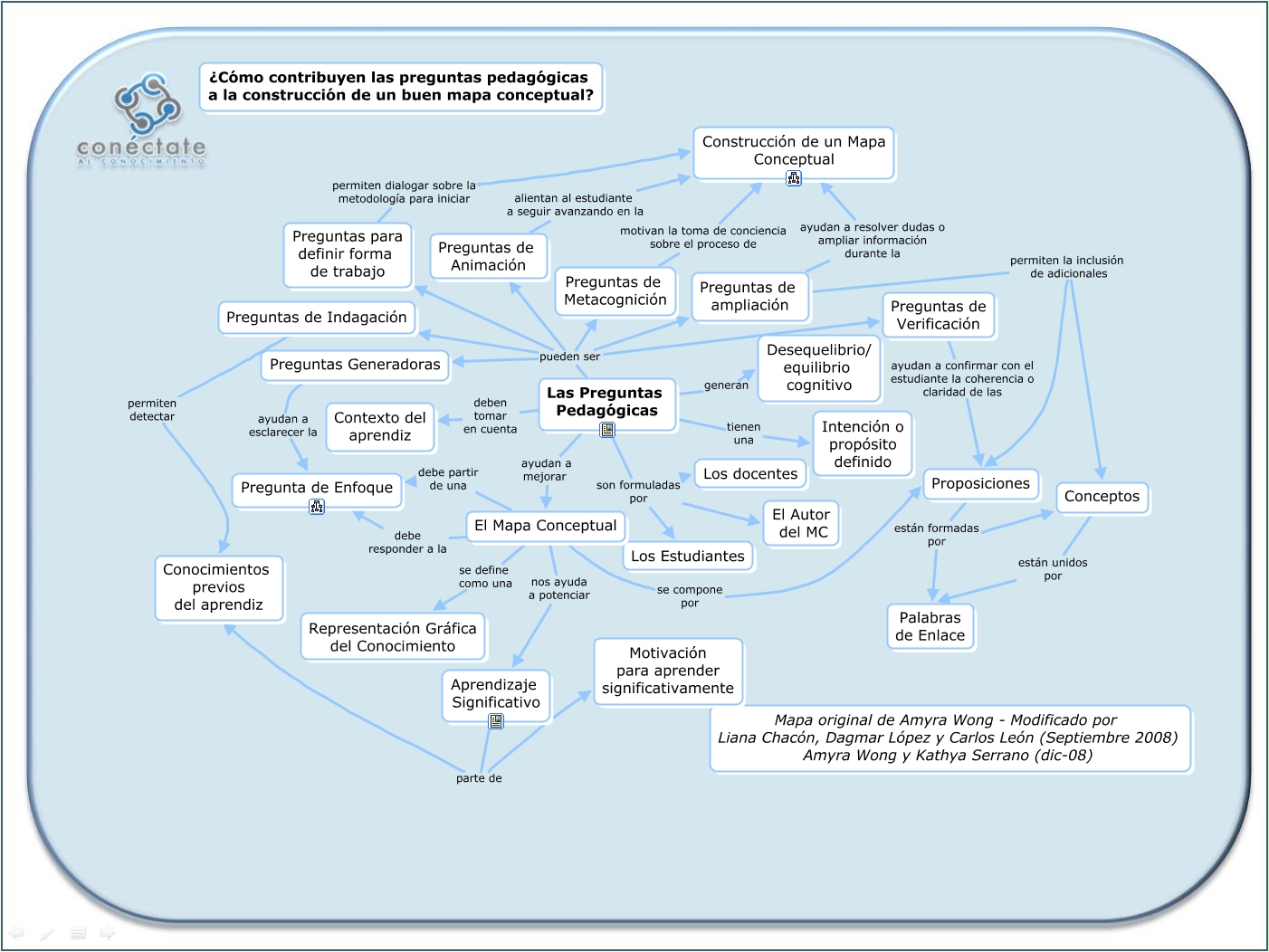 Este Cmap, tiene información relacionada con: Las Preguntas Pedagógicas, El Mapa Conceptual se compone por Proposiciones, Las Preguntas Pedagógicas pueden ser Preguntas de Animación, Las Preguntas Pedagógicas son formuladas por Los Estudiantes, Proposiciones están formadas por Conceptos, Conceptos están unidos por Palabras de Enlace, Las Preguntas Pedagógicas tienen una Intención o propósito definido, El Mapa Conceptual nos ayuda a potenciar Aprendizaje Significativo, El Mapa Conceptual se define como una Representación Gráfica del Conocimiento, Preguntas de ampliación permiten la inclusión de adicionales Conceptos, Las Preguntas Pedagógicas generan Desequelibrio/ equilibrio cognitivo, Las Preguntas Pedagógicas pueden ser Preguntas de ampliación, Preguntas de Metacognición motivan la toma de conciencia sobre el proceso de Construcción de un Mapa Conceptual, El Mapa Conceptual debe partir de una Pregunta de Enfoque, Preguntas de ampliación permiten la inclusión de adicionales Proposiciones, Preguntas Generadoras ayudan a esclarecer la Pregunta de Enfoque, Preguntas de Animación alientan al estudiante a seguir avanzando en la Construcción de un Mapa Conceptual, Las Preguntas Pedagógicas pueden ser Preguntas de Indagación, Las Preguntas Pedagógicas ayudan a mejorar El Mapa Conceptual, Aprendizaje Significativo parte de Motivación para aprender significativamente, Preguntas de ampliación ayudan a resolver dudas o ampliar información durante la Construcción de un Mapa Conceptual