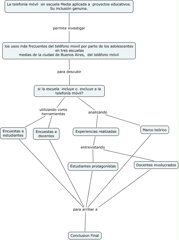 Este Cmap, tiene información relacionada con: prediseño, Experiencias realizadas entrevistando Docentes involucrados, si la escuela incluye o excluye a la telefonía móvil? utilizando como herramientas Encuestas a estudiantes, si la escuela incluye o excluye a la telefonía móvil? analizando Marco teórico, Encuestas a estudiantes para arribar a Conclusion Final, Experiencias realizadas entrevistando Estudiantes protagonistas, Estudiantes protagonistas para arribar a Conclusion Final, si la escuela incluye o excluye a la telefonía móvil? analizando Experiencias realizadas, los usos más frecuentes del teléfono movil por parte de los adolescentes en tres escuelas medias de la ciudad de Buenos Aires, del teléfono móvil para descubir si la escuela incluye o excluye a la telefonía móvil?, La telefonía móvil en escuela Media aplicada a proyectos educativos. Su inclusión genuina. permite investigar los usos más frecuentes del teléfono movil por parte de los adolescentes en tres escuelas medias de la ciudad de Buenos Aires, del teléfono móvil, Encuestas a docentes para arribar a Conclusion Final, Marco teórico para arribar a Conclusion Final, Docentes involucrados para arribar a Conclusion Final, si la escuela incluye o excluye a la telefonía móvil? utilizando como herramientas Encuestas a docentes