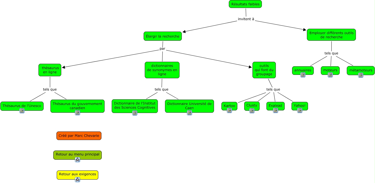 Cette carte de concepts créée avec IHMC CmapTools traite de: stratégies résultats faibles, Résultats faibles invitent à Employer différents outils de recherche, outils qui font du groupage tels que Clusty, outils qui font du groupage tels que Yahoo!, Employer différents outils de recherche tels que métamoteurs, Employer différents outils de recherche tels que moteurs, Élargir la recherche par dictionnaires de synonymes en ligne, Élargir la recherche par outils qui font du groupage, thésaurus en ligne tels que Thésaurus du gouvernement canadien, Élargir la recherche par thésaurus en ligne, thésaurus en ligne tels que Thésaurus de l'Unesco, Employer différents outils de recherche tels que annuaires, outils qui font du groupage tels que Exalead, outils qui font du groupage tels que Kartoo, Résultats faibles invitent à Élargir la recherche, dictionnaires de synonymes en ligne tels que Dictionnaire Université de Caen, dictionnaires de synonymes en ligne tels que Dictionnaire de l'Institut des Sciences Cognitives