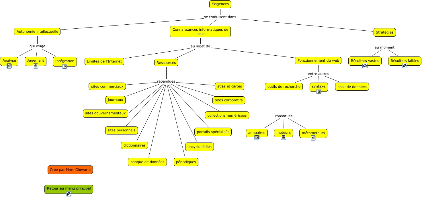 Cette carte de concepts créée avec IHMC CmapTools traite de: exigences globales internet, Fonctionnement du web entre autres base de données, outils de recherche constitués moteurs, Ressources répandues atlas et cartes, Autonomie intellectuelle qui exige Analyse, Ressources répandues sites corporatifs, Ressources répandues collections numérisées, Ressources répandues journaux, Ressources répandues portails spécialisés, outils de recherche constitués annuaires, Stratégies au moment Résultats vastes, Connaissances informatiques de base au sujet de Ressources, Autonomie intellectuelle qui exige Jugement, Autonomie intellectuelle qui exige Intégration, Fonctionnement du web entre autres outils de recherche, Exigences se traduisent dans Stratégies, Ressources répandues banque de données, Connaissances informatiques de base au sujet de Fonctionnement du web, outils de recherche constitués métamoteurs, Stratégies au moment Résultats faibles, Exigences se traduisent dans Autonomie intellectuelle