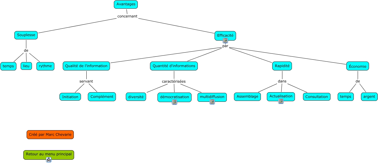 Cette carte de concepts créée avec IHMC CmapTools traite de: avantages internet, Rapidité dans Consultation, Souplesse de rythme, Rapidité dans Assemblage, Quantité d'informations caractérisées diversité, Avantages concernant Efficacité, Quantité d'informations caractérisées multidiffusion, Économie de argent, Souplesse de temps, Qualité de l'information servant Complément, Efficacité par Économie, Économie de temps, Souplesse de lieu, Efficacité par Rapidité, Efficacité par Quantité d'informations, Avantages concernant Souplesse, Quantité d'informations caractérisées démocratisation, Qualité de l'information servant Initiation, Efficacité par Qualité de l'information, Rapidité dans Actualisation