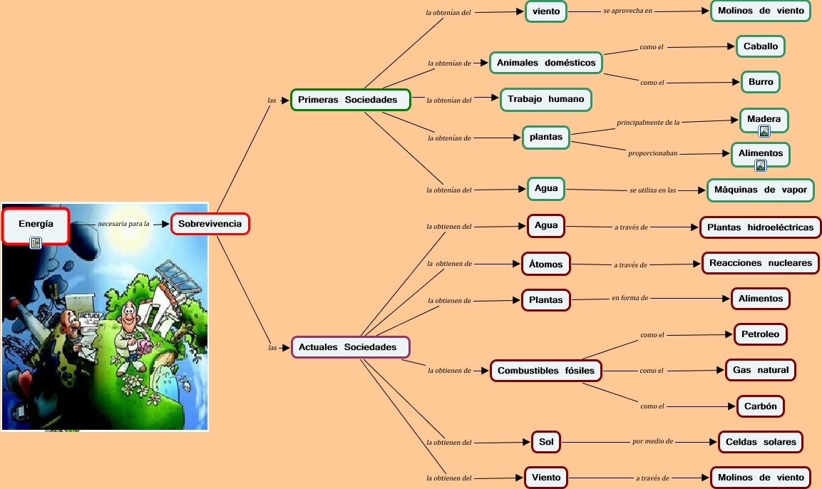 Este Cmap, tiene información relacionada con: Energía, plantas principalmente de la Madera, Combustibles fósiles como el Petroleo, Átomos a través de Reacciones nucleares, Primeras Sociedades la obtenían del Trabajo humano, Primeras Sociedades la obtenían de Animales domésticos, Actuales Sociedades la obtienen de Combustibles fósiles, Animales domésticos como el Burro, Plantas en forma de Alimentos, viento se aprovecha en Molinos de viento, Combustibles fósiles como el Gas natural, Actuales Sociedades la obtienen del Sol, Actuales Sociedades la obtienen del Agua, Primeras Sociedades la obtenían de plantas, Agua a través de Plantas hidroeléctricas, plantas proporcionaban Alimentos, Actuales Sociedades la obtienen de Plantas, Viento a través de Molinos de viento, Actuales Sociedades la obtienen del Viento, Agua se utiliza en las Máquinas de vapor, Primeras Sociedades la obtenían del Agua