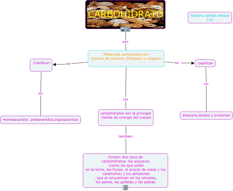 Este Cmap, tiene información relacionada con: yonairis, Moleculas compuestas por atomos de carbono ,hidrigeno y oxigeno. los carbohidratos son la principal fuente de energía del cuerpo, Moleculas compuestas por atomos de carbono ,hidrigeno y oxigeno. se Clasifican, Moleculas compuestas por atomos de carbono ,hidrigeno y oxigeno. se clasifican, Clasifican en monosacaridos ,polisacaridos,oligosacaridos, clasifican en disacario,lipidos y proteinas, carbohidratos son la principal fuente de energía del cuerpo tambien Existen dos tipos de carbohidratos: los azúcares (como los que están en la leche, las frutas, el azúcar de mesa y los caramelos) y los almidones , que se encuentran en los cereales, los panes, las galletas y las pastas., CARBOHIDRATO son Moleculas compuestas por atomos de carbono ,hidrigeno y oxigeno.