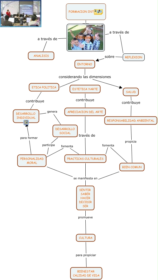 Este Cmap, tiene información relacionada con: FORMACION HUMANA Y SOCIAL, PRACTICAS CULTURALES se manifiesta en SENTIR SABER HACER DECIDIR SER, CULTURA para propiciar BIENESTAR CALIDAD DE VIDA, SALUD contribuye RESPONSABILIDAD ANBIENTAL, RESPONSABILIDAD ANBIENTAL propicia BIEN COMUN, PRACTICAS CULTURALES fomenta ????, ESTUDIANTE a través de ANALISIS, FORMACION INTEGRAL ???? ESTUDIANTE, PERSONALIDAD MORAL para formar DESARROLLO INDIVIDUAL, BIEN COMUN fomenta PRACTICAS CULTURALES, SENTIR SABER HACER DECIDIR SER promueve CULTURA, ENTORNO considerando las dimensiones ETICA POLITICA, REFLEXION sobre ENTORNO, ESTUDIANTE a través de REFLEXION, DESARROLLO SOCIAL participa PERSONALIDAD MORAL, APRECIACION DEL ARTE A través de PRACTICAS CULTURALES, ESTETICA YARTE contribuye APRECIACION DEL ARTE, BIEN COMUN se manifiesta en SENTIR SABER HACER DECIDIR SER, ETICA POLITICA contribuye DESARROLLO INDIVIDUAL, DESARROLLO INDIVIDUAL genera DESARROLLO SOCIAL, PERSONALIDAD MORAL se manifiesta en SENTIR SABER HACER DECIDIR SER