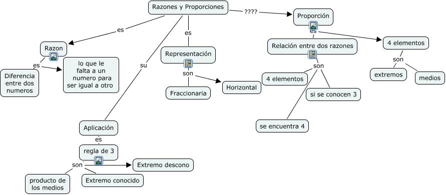 Este Cmap, tiene información relacionada con: Razones y proporciones, Proporción es 4 elementos, regla de 3 son Extremo descono, Relación entre dos razones son si se conocen 3, Representación son Horizontal, Razones y Proporciones es Representación, regla de 3 son producto de los medios, Razon es lo que le falta a un numero para ser igual a otro, regla de 3 son Extremo conocido, Aplicación es regla de 3, Relación entre dos razones son 4 elementos, Razones y Proporciones ???? Proporción, 4 elementos son medios, Razones y Proporciones su Aplicación, Razones y Proporciones es Razon, Representación son Fraccionaria, Proporción es Relación entre dos razones, Razon es Diferencia entre dos numeros, Relación entre dos razones son se encuentra 4, 4 elementos son extremos