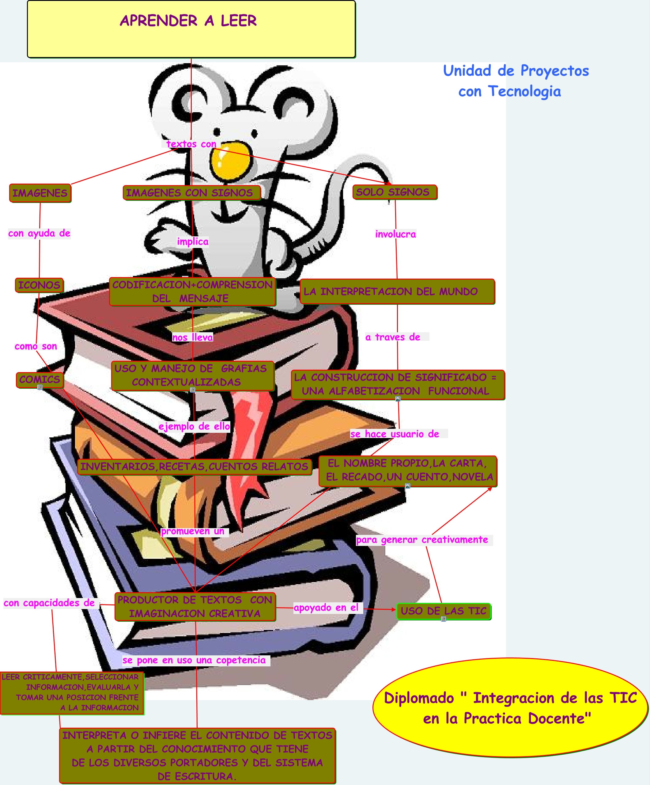 Este Cmap, tiene información relacionada con: APRENDER A LEER 1, CODIFICACION+COMPRENSION DEL MENSAJE nos lleva USO Y MANEJO DE GRAFIAS CONTEXTUALIZADAS, INVENTARIOS,RECETAS,CUENTOS RELATOS promueven un PRODUCTOR DE TEXTOS CON IMAGINACION CREATIVA, PRODUCTOR DE TEXTOS CON IMAGINACION CREATIVA apoyado en el USO DE LAS TIC, APRENDER A LEER textos con IMAGENES, IMAGENES CON SIGNOS implica CODIFICACION+COMPRENSION DEL MENSAJE, USO Y MANEJO DE GRAFIAS CONTEXTUALIZADAS ejemplo de ello INVENTARIOS,RECETAS,CUENTOS RELATOS, LA CONSTRUCCION DE SIGNIFICADO = UNA ALFABETIZACION FUNCIONAL se hace usuario de PRODUCTOR DE TEXTOS CON IMAGINACION CREATIVA, PRODUCTOR DE TEXTOS CON IMAGINACION CREATIVA con capacidades de INTERPRETA O INFIERE EL CONTENIDO DE TEXTOS A PARTIR DEL CONOCIMIENTO QUE TIENE DE LOS DIVERSOS PORTADORES Y DEL SISTEMA DE ESCRITURA., SOLO SIGNOS involucra LA INTERPRETACION DEL MUNDO, APRENDER A LEER textos con IMAGENES CON SIGNOS, PRODUCTOR DE TEXTOS CON IMAGINACION CREATIVA se pone en uso una copetencia INTERPRETA O INFIERE EL CONTENIDO DE TEXTOS A PARTIR DEL CONOCIMIENTO QUE TIENE DE LOS DIVERSOS PORTADORES Y DEL SISTEMA DE ESCRITURA., ICONOS como son PRODUCTOR DE TEXTOS CON IMAGINACION CREATIVA, APRENDER A LEER textos con SOLO SIGNOS, USO DE LAS TIC para generar creativamente EL NOMBRE PROPIO,LA CARTA, EL RECADO,UN CUENTO,NOVELA, IMAGENES con ayuda de ICONOS, LA INTERPRETACION DEL MUNDO a traves de LA CONSTRUCCION DE SIGNIFICADO = UNA ALFABETIZACION FUNCIONAL
