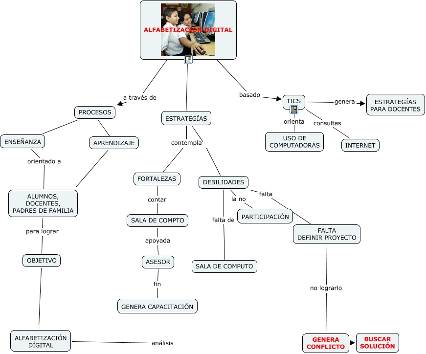 Este Cmap, tiene información relacionada con: ALFABETIZACION-DIGITAL, DEBILIDADES la no PARTICIPACIÓN, ESTRATEGÍAS contempla FORTALEZAS, ASESOR fin GENERA CAPACITACIÓN, ALUMNOS, DOCENTES, PADRES DE FAMILIA para lograr OBJETIVO, ESTRATEGÍAS DEBILIDADES, DEBILIDADES falta de SALA DE COMPUTO, ALFABETIZACIÓN DÍGITAL análisis BUSCAR SOLUCIÓN, ALFABETIZACIÓN DÍGITAL basado TICS, TICS consultas INTERNET, PROCESOS APRENDIZAJE, TICS genera ESTRATEGÍAS PARA DOCENTES, DEBILIDADES falta FALTA DEFINIR PROYECTO, ALFABETIZACIÓN DÍGITAL ESTRATEGÍAS, FALTA DEFINIR PROYECTO no lograrlo GENERA CONFLICTO, APRENDIZAJE ALUMNOS, DOCENTES, PADRES DE FAMILIA, FORTALEZAS contar SALA DE COMPTO, SALA DE COMPTO apoyada ASESOR, TICS orienta USO DE COMPUTADORAS, PROCESOS ENSEÑANZA, OBJETIVO ALFABETIZACIÓN DÍGITAL