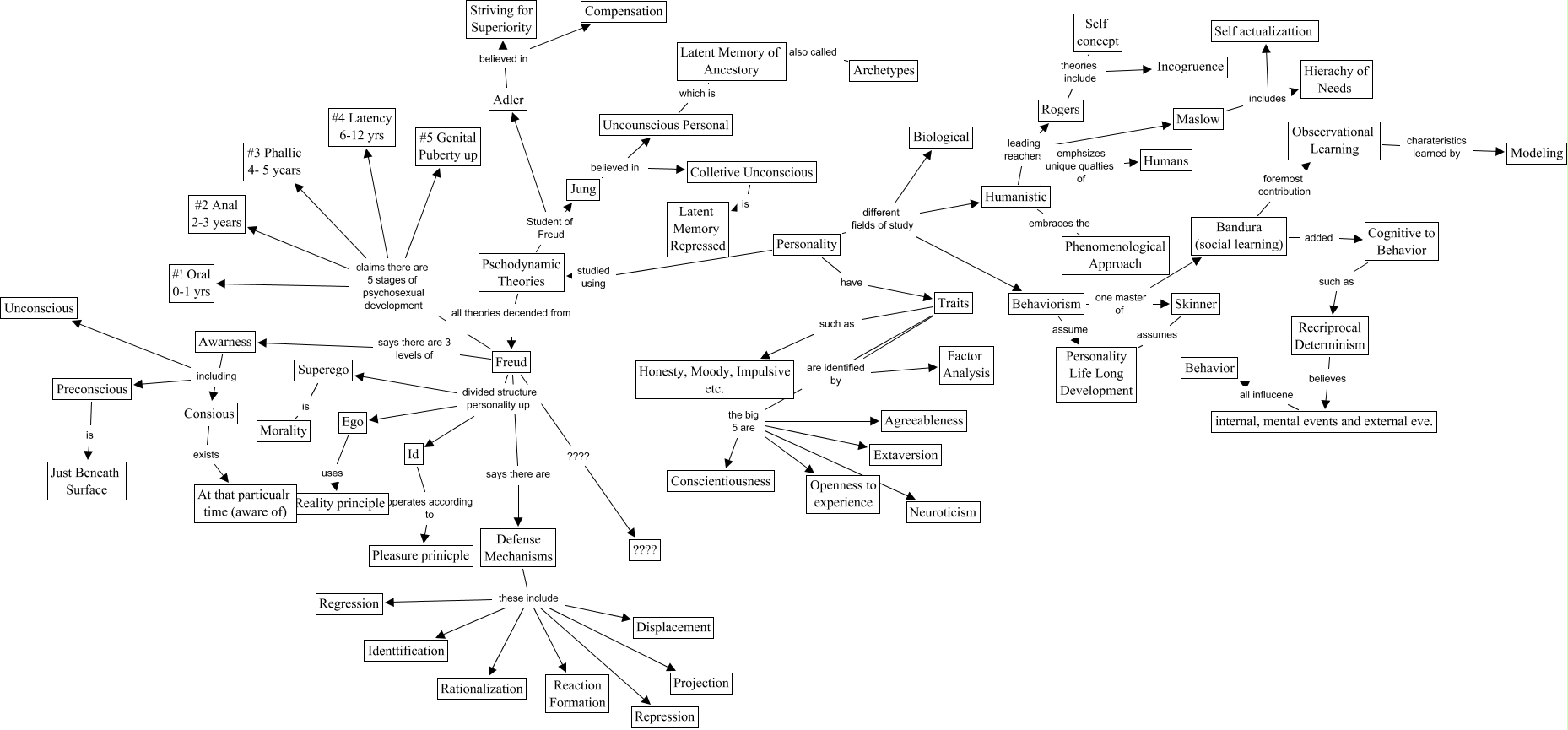 Questa Cmap, creata con IHMC CmapTools, contiene informazioni relative a: freud inglese, Uncounscious Personal which is Latent Memory of Ancestory, Traits such as Honesty, Moody, Impulsive etc., Defense Mechanisms these include Projection, Humanistic emphsizes unique qualties of Humans, Adler believed in Striving for Superiority, Behaviorism one master of Skinner, Freud divided structure personality up Superego, Obseervational Learning charateristics learned by Modeling, Recriprocal Determinism believes internal, mental events and external eve., Defense Mechanisms these include Rationalization, Superego is Morality, Traits the big 5 are Neuroticism, Skinner assumes Personality Life Long Development, Traits the big 5 are Extaversion, Preconscious is Just Beneath Surface, Rogers theories include Self concept, Freud says there are Defense Mechanisms, Pschodynamic Theories Student of Freud Jung, Freud claims there are 5 stages of psychosexual development #! Oral 0-1 yrs, Freud claims there are 5 stages of psychosexual development #3 Phallic 4- 5 years