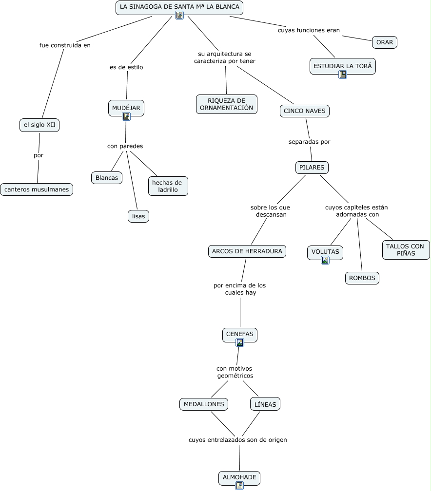 Este Cmap, tiene información relacionada con: SINAGOGA SANTA MARÍA LA BLANCA, CENEFAS con motivos geométricos LÍNEAS, CENEFAS con motivos geométricos MEDALLONES, MUDÉJAR con paredes lisas, MUDÉJAR con paredes hechas de ladrillo, LA SINAGOGA DE SANTA Mª LA BLANCA fue construida en el siglo XII, LA SINAGOGA DE SANTA Mª LA BLANCA su arquitectura se caracteriza por tener RIQUEZA DE ORNAMENTACIÓN, MEDALLONES cuyos entrelazados son de origen LÍNEAS, LA SINAGOGA DE SANTA Mª LA BLANCA cuyas funciones eran ORAR, LA SINAGOGA DE SANTA Mª LA BLANCA cuyas funciones eran ESTUDIAR LA TORÁ, el siglo XII por canteros musulmanes, CINCO NAVES separadas por PILARES, ARCOS DE HERRADURA por encima de los cuales hay CENEFAS, MEDALLONES cuyos entrelazados son de origen ALMOHADE, LA SINAGOGA DE SANTA Mª LA BLANCA su arquitectura se caracteriza por tener CINCO NAVES, PILARES cuyos capiteles están adornadas con ROMBOS, PILARES sobre los que descansan ARCOS DE HERRADURA, MUDÉJAR con paredes Blancas, PILARES cuyos capiteles están adornadas con VOLUTAS, LA SINAGOGA DE SANTA Mª LA BLANCA es de estilo MUDÉJAR, PILARES cuyos capiteles están adornadas con TALLOS CON PIÑAS