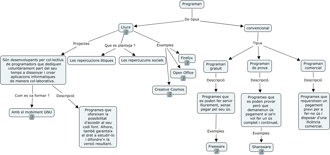 Este Cmap, tiene información relacionada con: Programari, Programari comercial Descripció Programes que requereixen un pagament previ per a fer-ne ús i disposar d'una llicència comercial., Programes que es poden provar però que demanenun ús pagament si se'n vol fer un ús complet i continuat. Exemples Shareware, Programari De tipus Lliure, Lliure Que es planteja ? Les repercucuins socials, Lliure Que es planteja ? Les repercucions ètiques, Programari De tipus convencional, convencional Tipus Programari de prova, Són desenvolupants per col·lectius de programadors que dediquen voluntàriament part del seu temps a dissenyar i crear aplicacions informatiques de manera col·laborativa. Com es va formar ? Amb el mobiment GNU, Lliure Exemples Creative Cosmos, Programari gratuït Descripció Programes que es poden fer servir lliurement, sense pagar pel seu ús., Són desenvolupants per col·lectius de programadors que dediquen voluntàriament part del seu temps a dissenyar i crear aplicacions informatiques de manera col·laborativa. Descripció Programes que ofereixen la possibilitat d'accedir al seu codi font. Alhora, també garanteix el dret a estudir-lo i difondre'n la versió resultant., Lliure Projectes Són desenvolupants per col·lectius de programadors que dediquen voluntàriament part del seu temps a dissenyar i crear aplicacions informatiques de manera col·laborativa., Programes que es poden fer servir lliurement, sense pagar pel seu ús. Exemples Freeware, convencional Tipus Programari gratuït, convencional Tipus Programari comercial, Programari de prova Descripció Programes que es poden provar però que demanenun ús pagament si se'n vol fer un ús complet i continuat., Lliure Exemples Firefox, Lliure Exemples Open Office